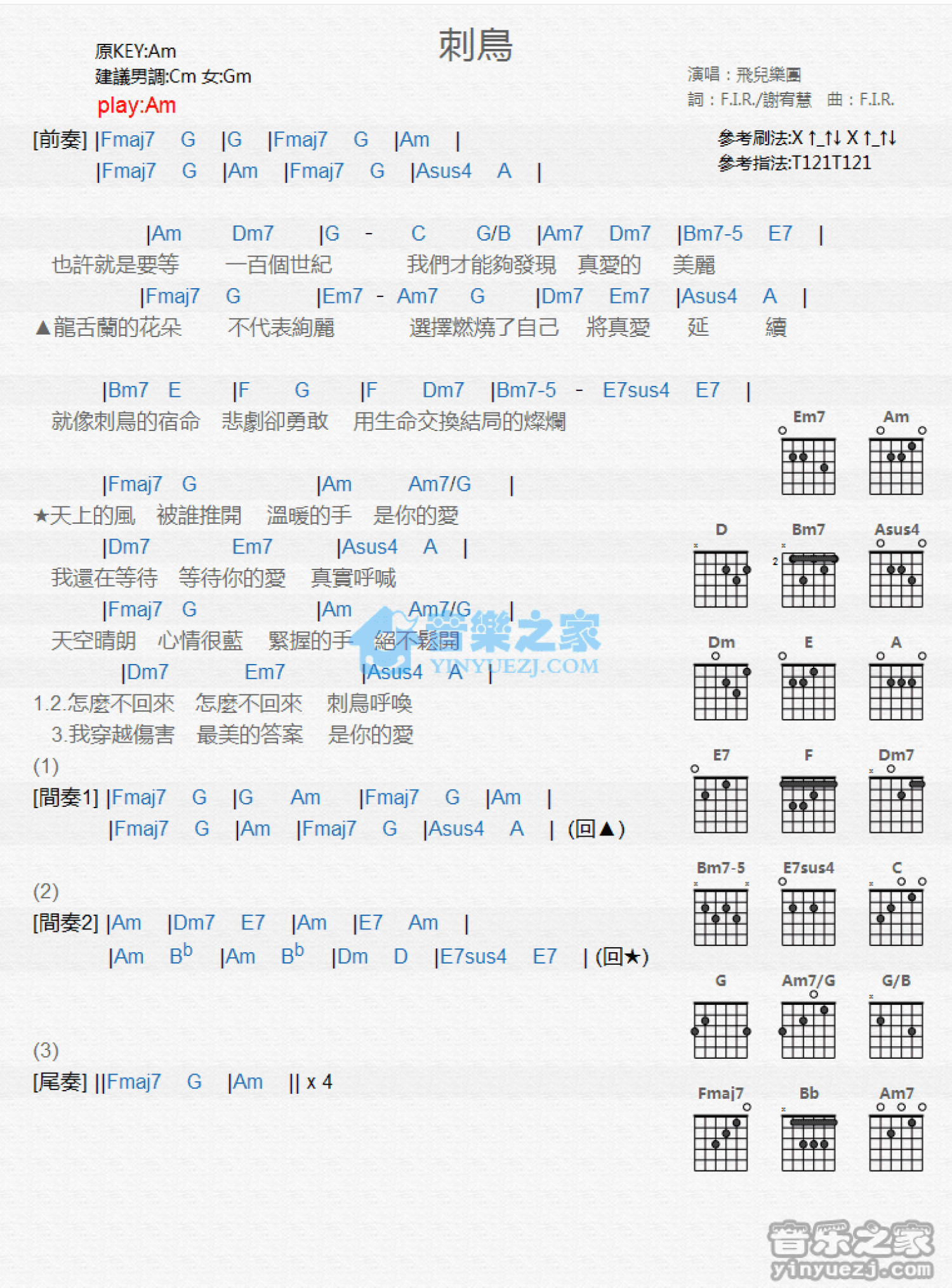 曲谱介绍: Am调版《刺鸟》吉他和弦弹唱谱