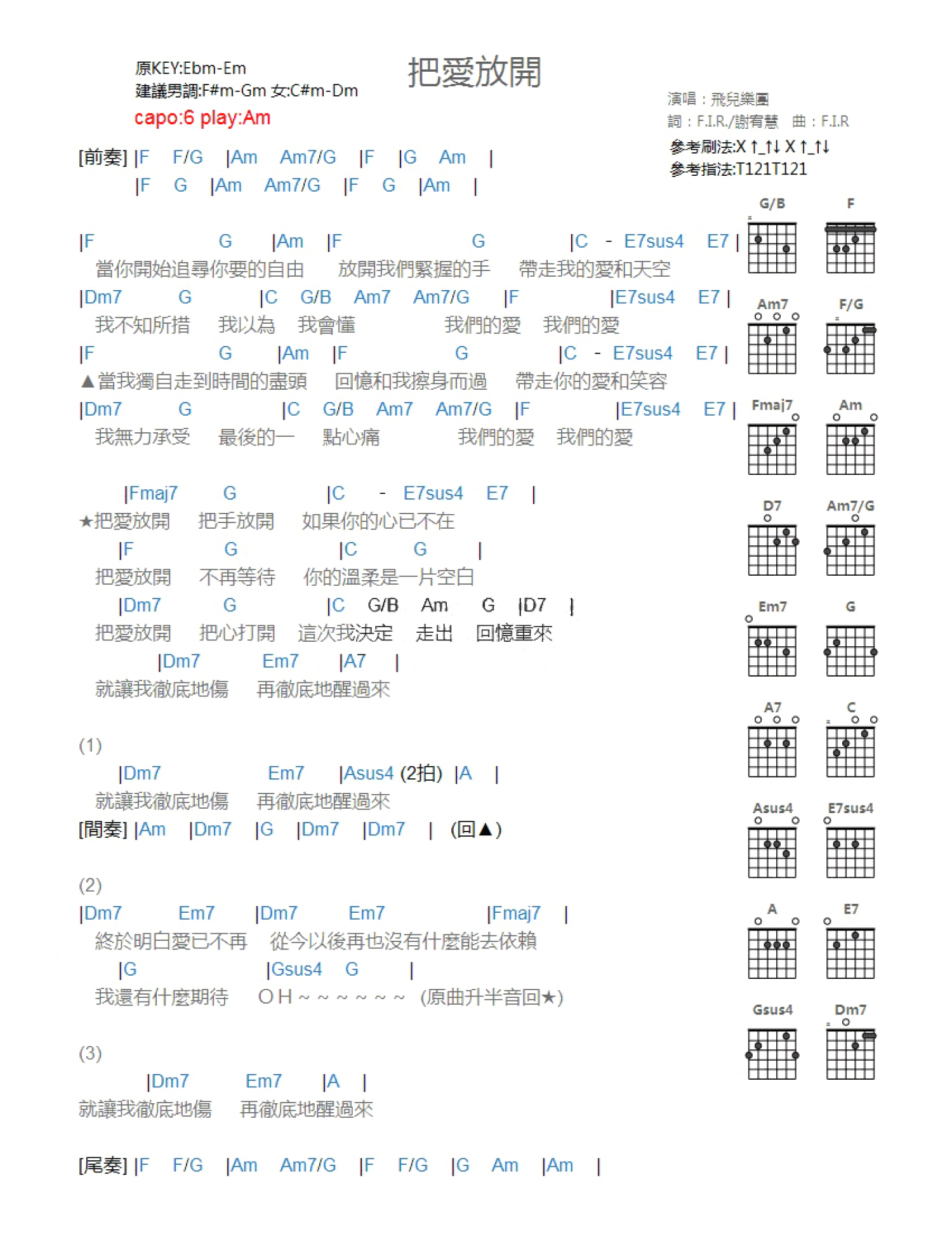 曲谱介绍: Am调版《把爱放开》吉他和弦弹唱谱