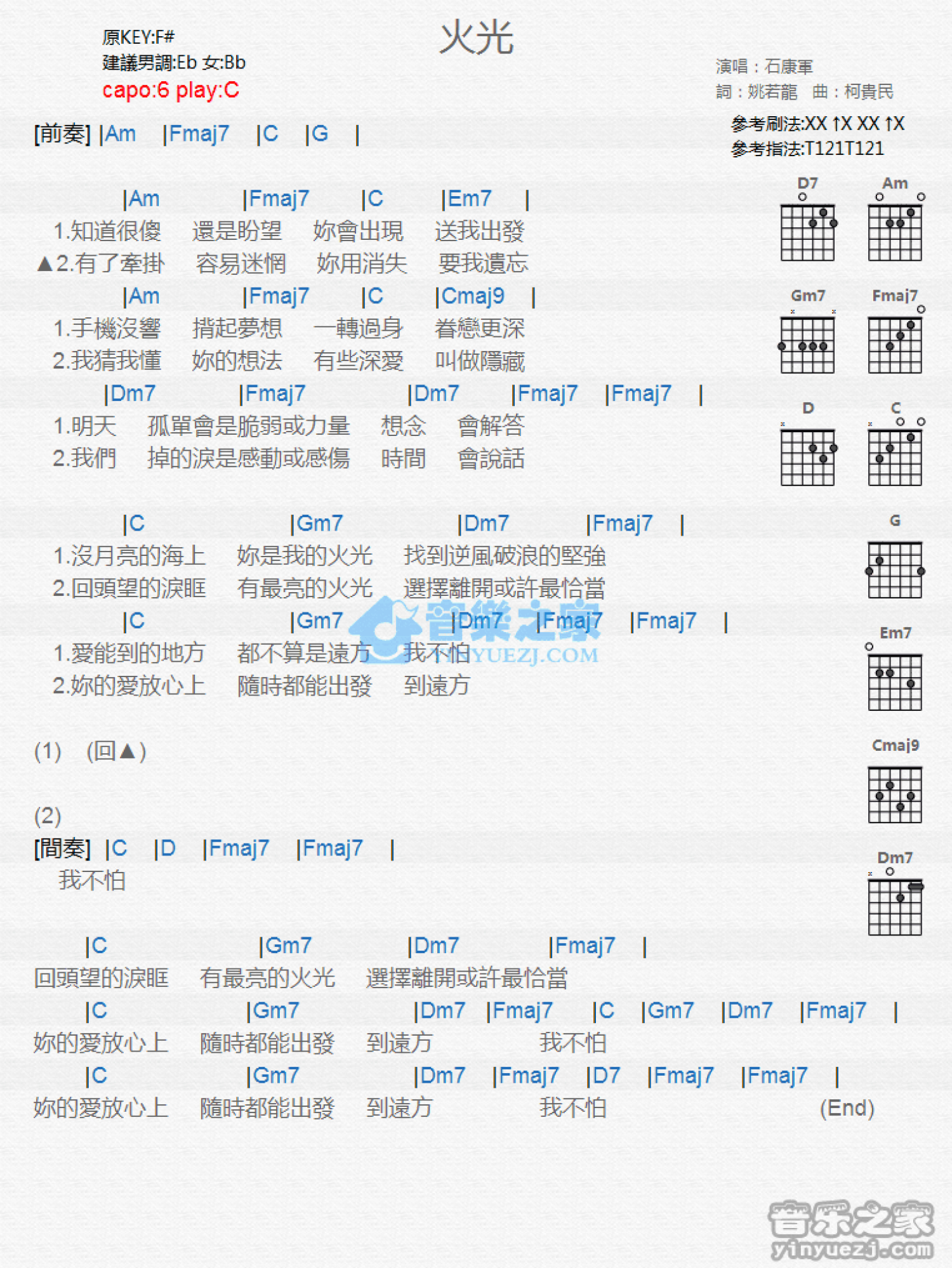 曲谱介绍: C调版石康军《火光》吉他和弦弹唱谱