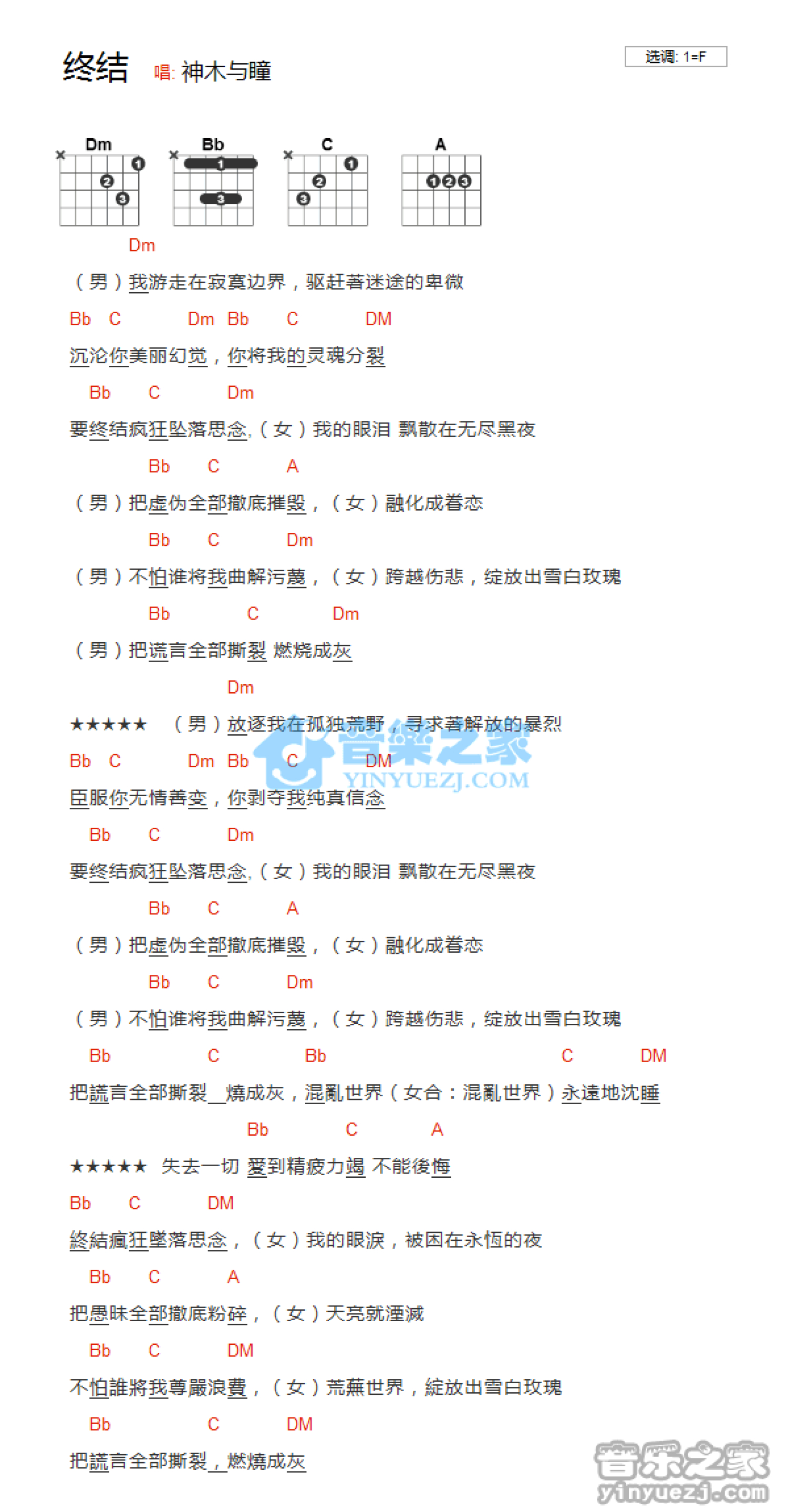 曲谱介绍: F调版神木与瞳《终结》吉他和弦弹唱谱