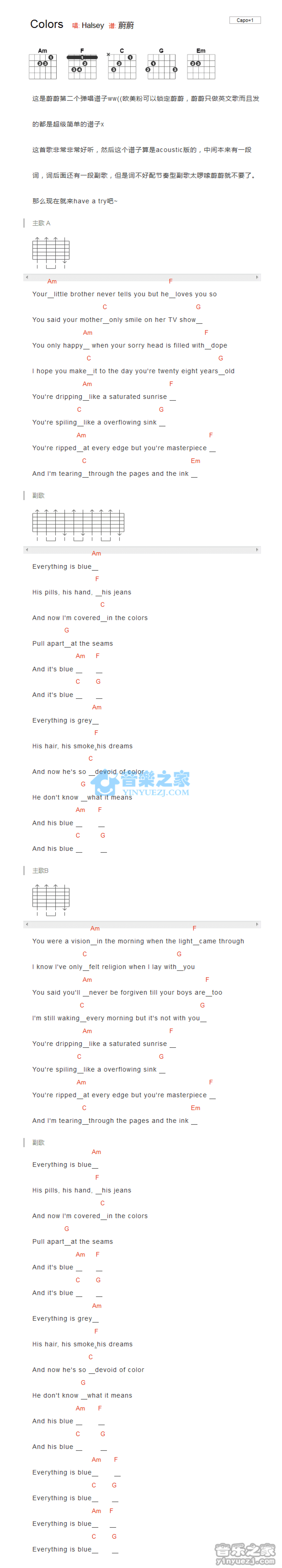 曲谱介绍: Halsey《Colors》吉他和弦弹唱谱