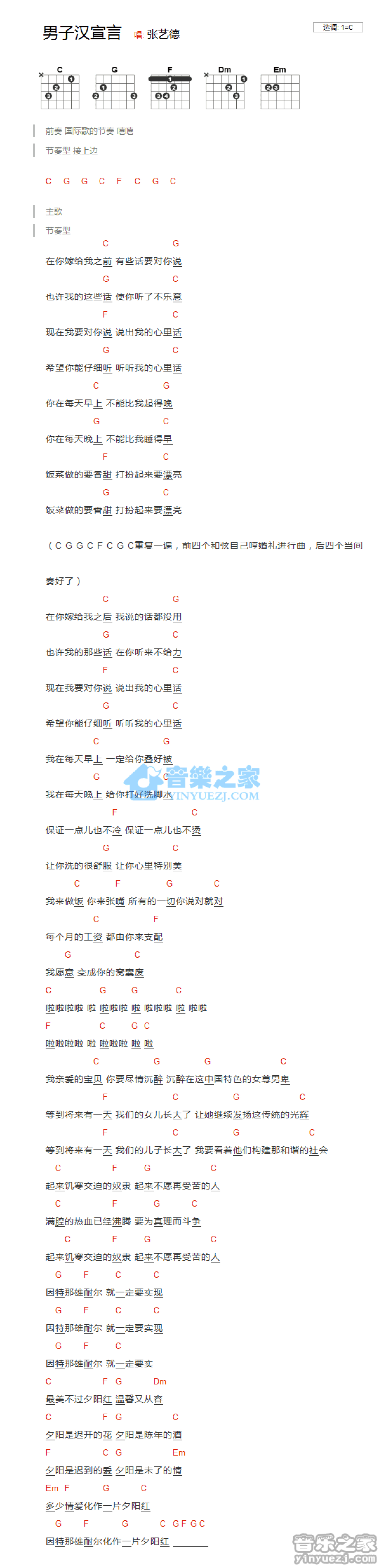 曲谱介绍: C调版《男子汉宣言》吉他和弦弹唱谱