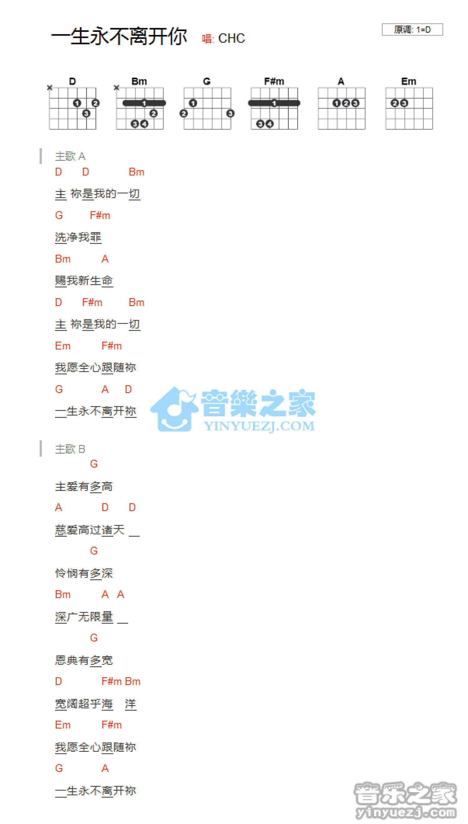 曲谱介绍: D调版CHC《一生永不离开你》吉他和弦弹唱谱