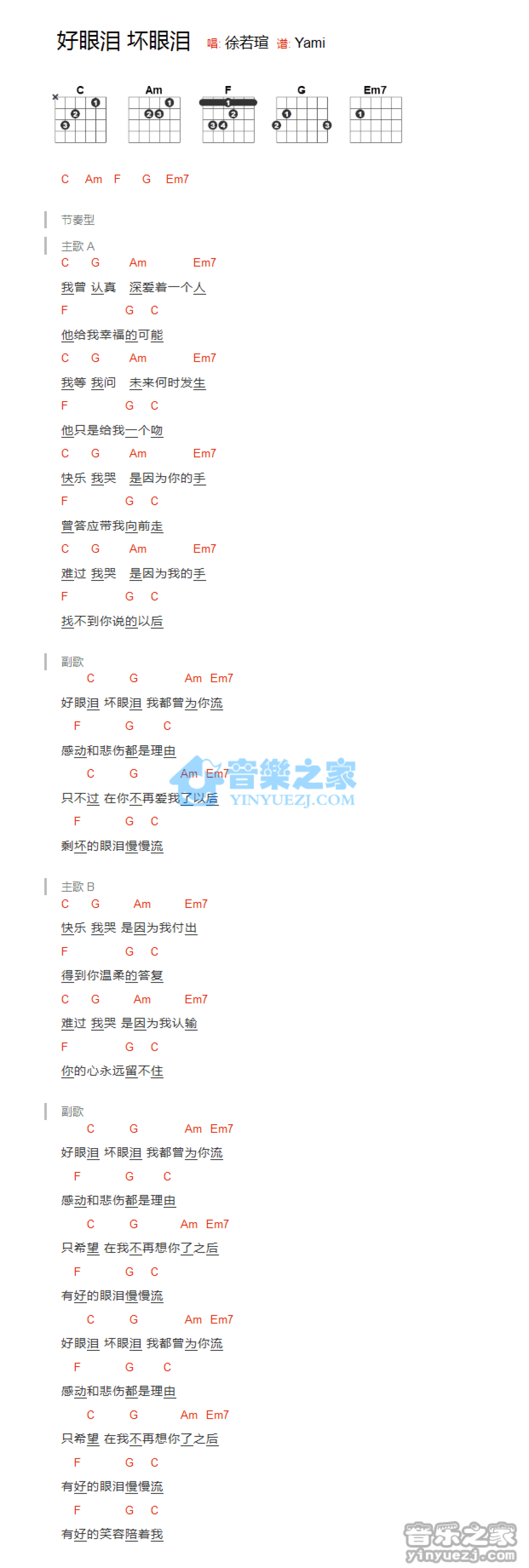 曲谱介绍: 徐若u《好眼泪坏眼泪》吉他和弦弹唱谱