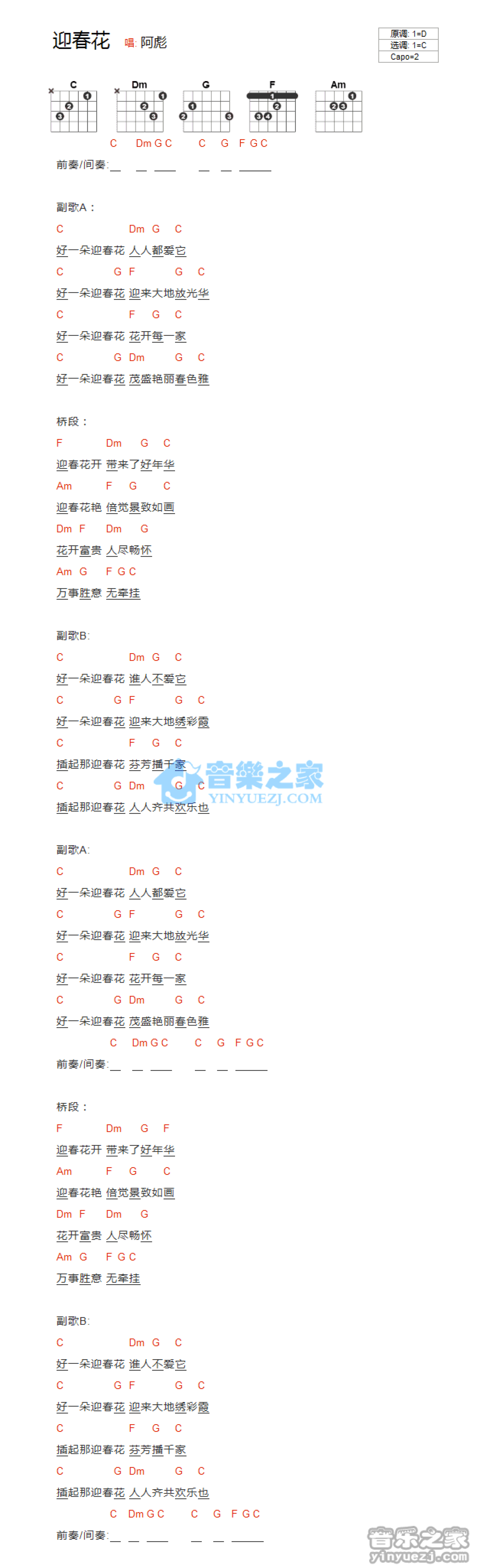 曲谱介绍: C调版《迎春花》吉他和弦弹唱谱