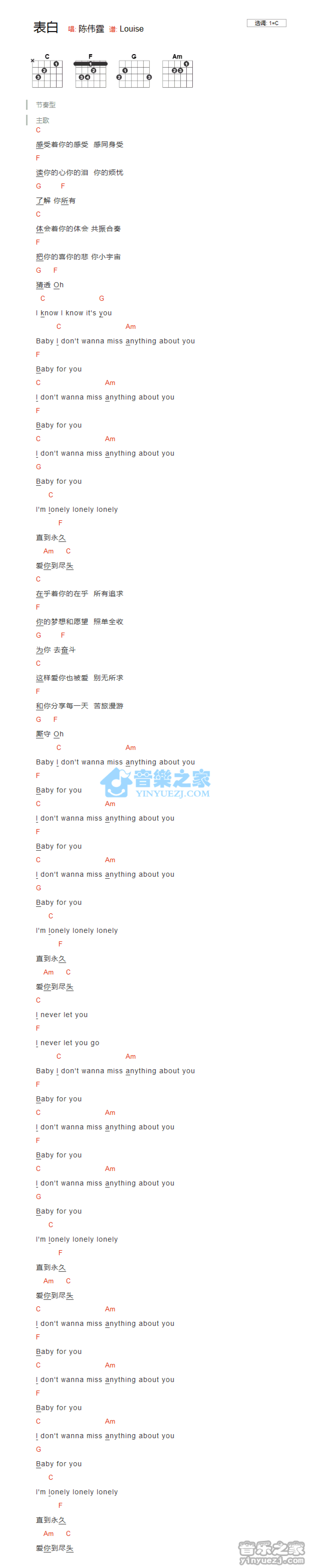 曲谱介绍: C调版陈伟霆《表白》吉他和弦弹唱谱