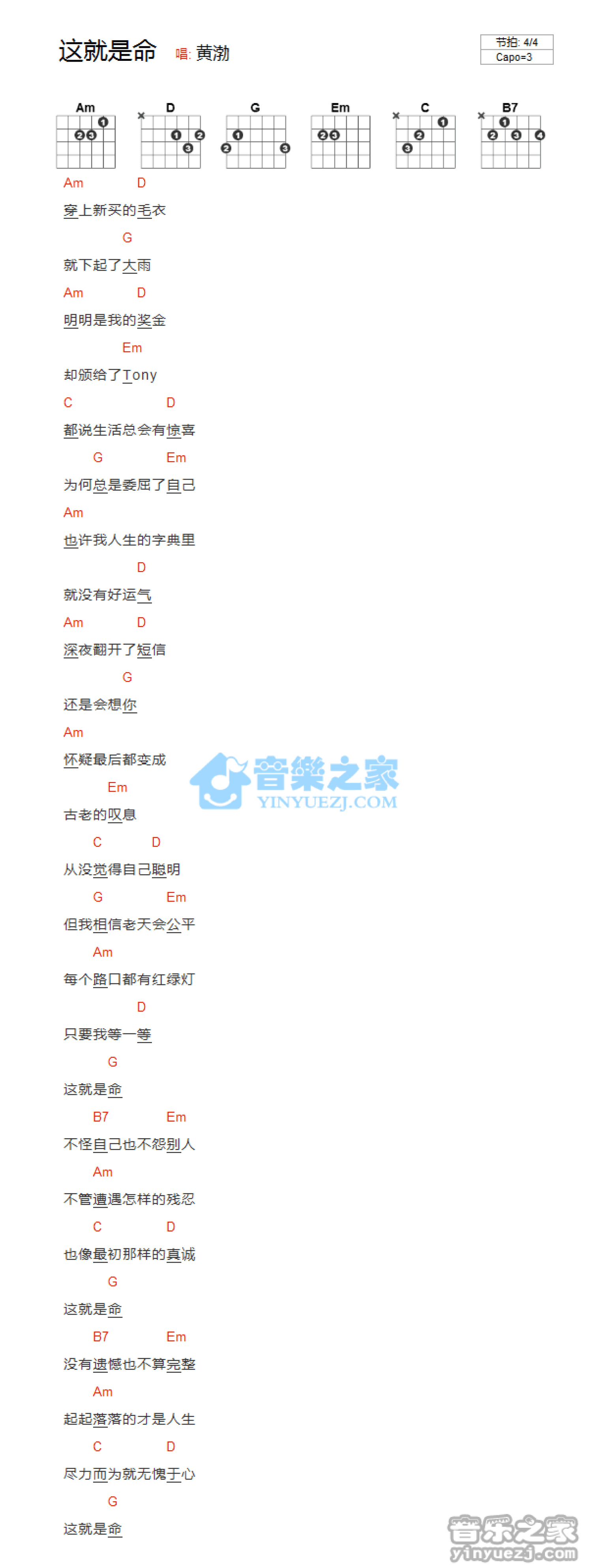 曲谱介绍: 黄渤《这就是命》吉他和弦弹唱谱