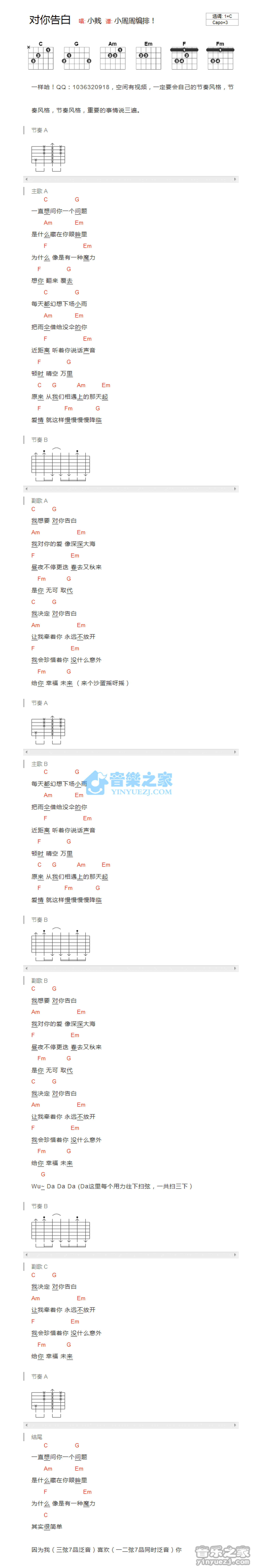 曲谱介绍: C调版小贱《对你告白》吉他和弦弹唱谱