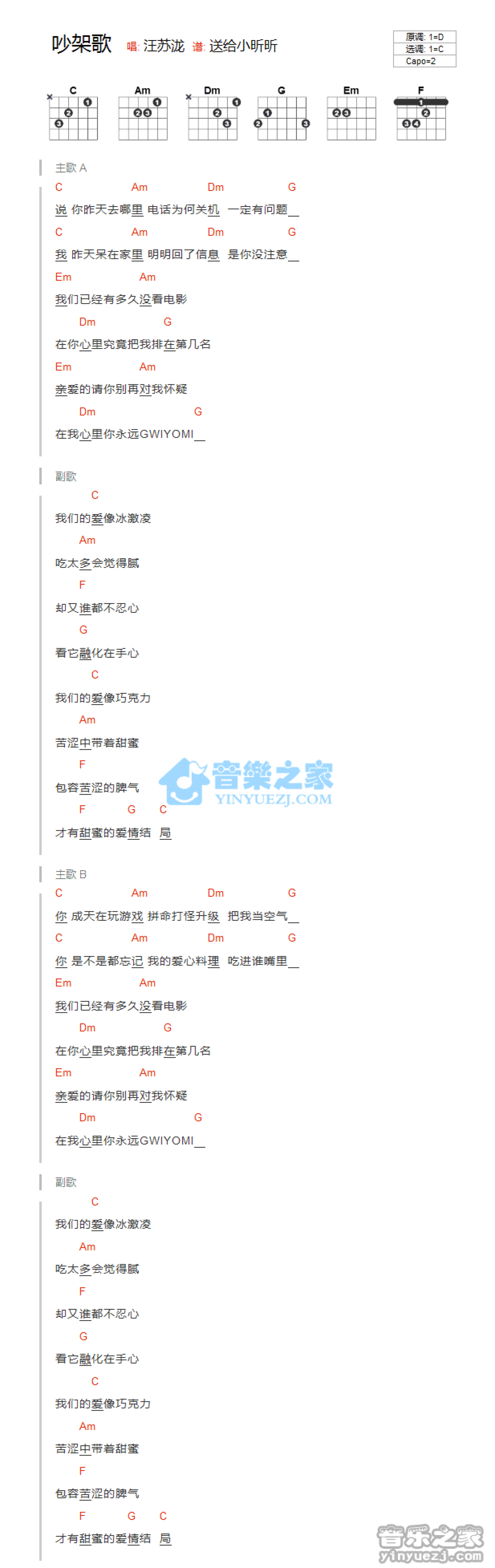曲谱介绍: C调版汪苏泷《吵架歌》吉他和弦弹唱谱