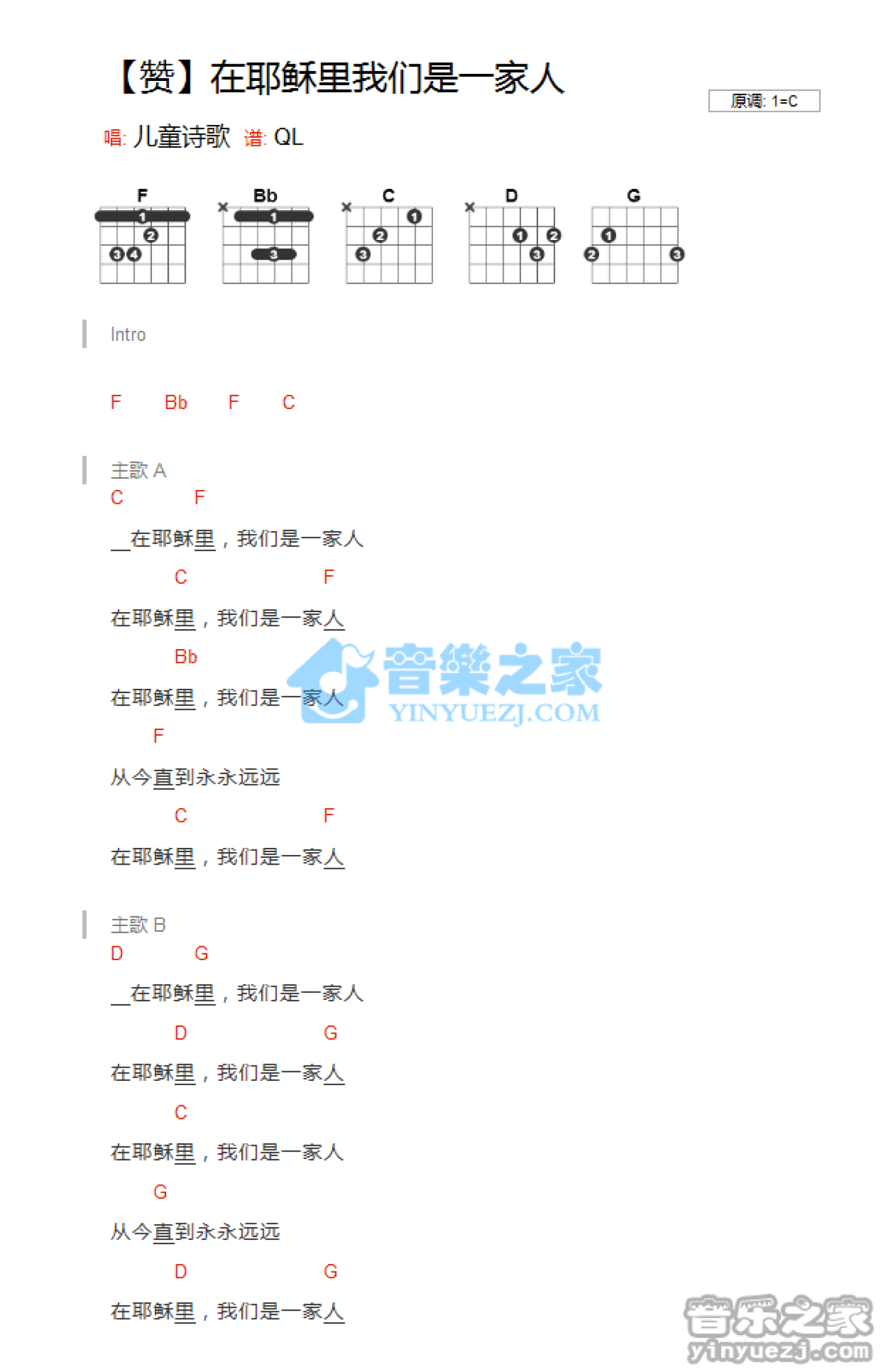 曲谱介绍: C调版儿童诗歌《在耶稣里我们是一家人》吉他和弦弹唱谱