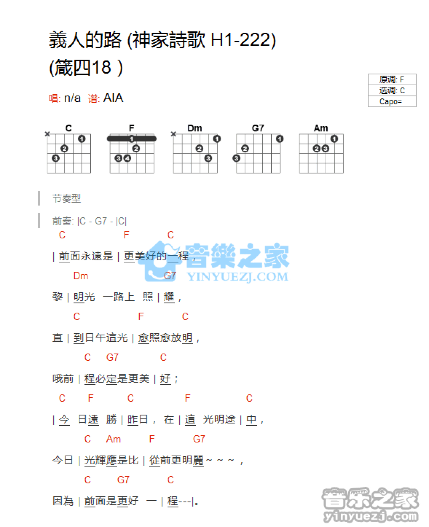 曲谱介绍: C调版神家诗歌《义人的路》吉他和弦弹唱谱