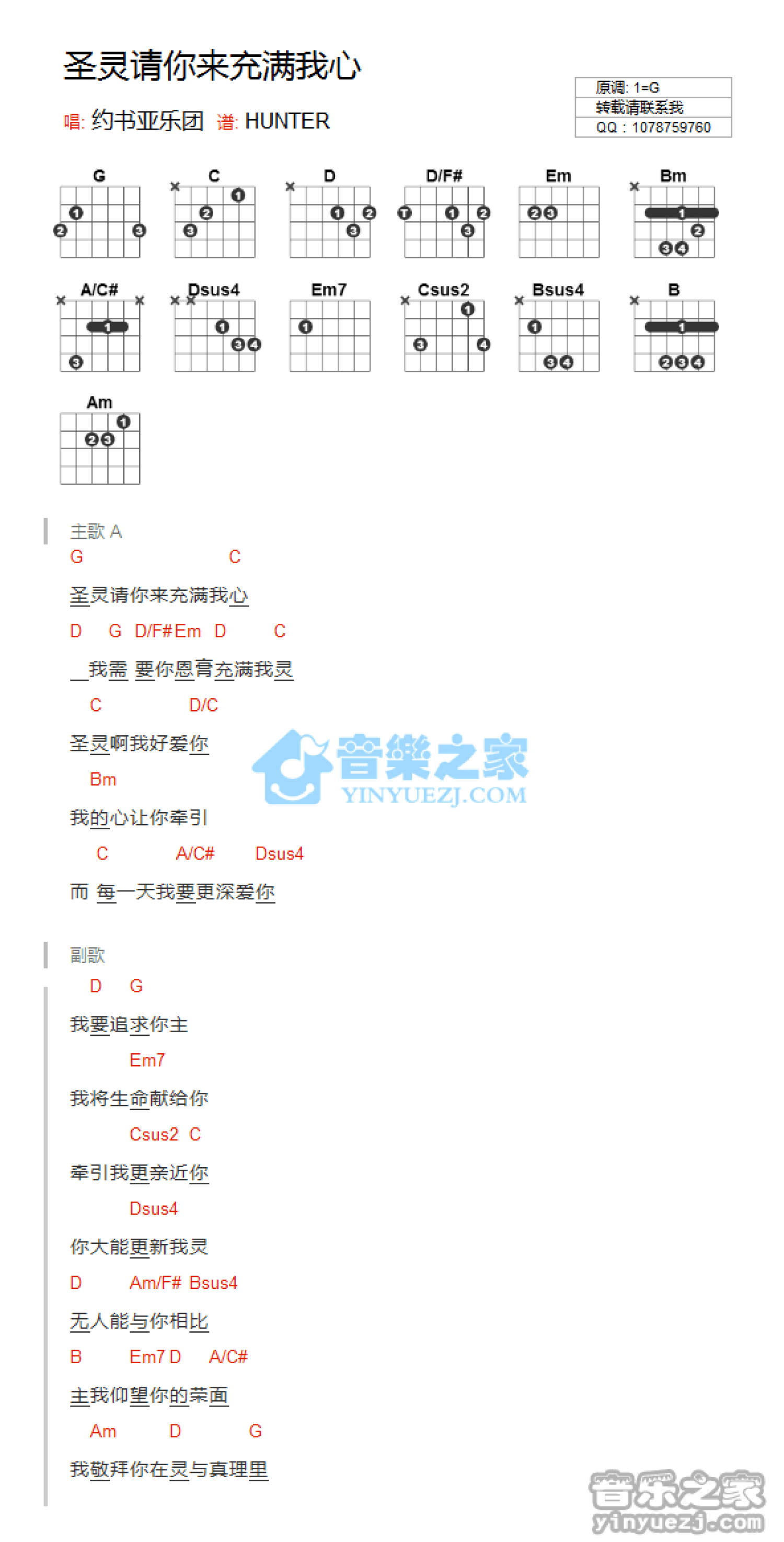曲谱介绍: G调版《圣灵请你来充满我的心》吉他和弦弹唱谱