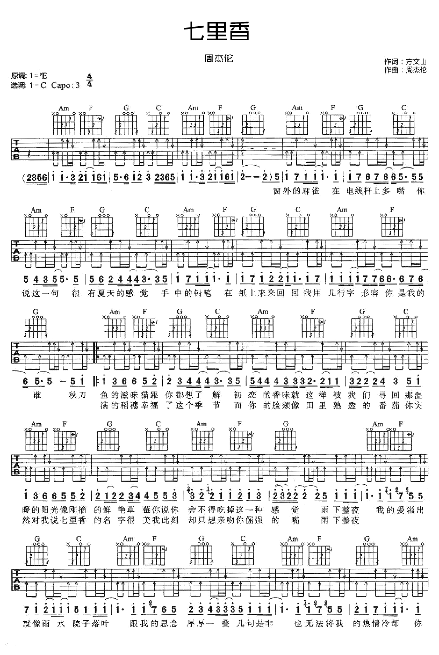 七里香吉他谱 - 周杰伦 - C调吉他弹唱谱
