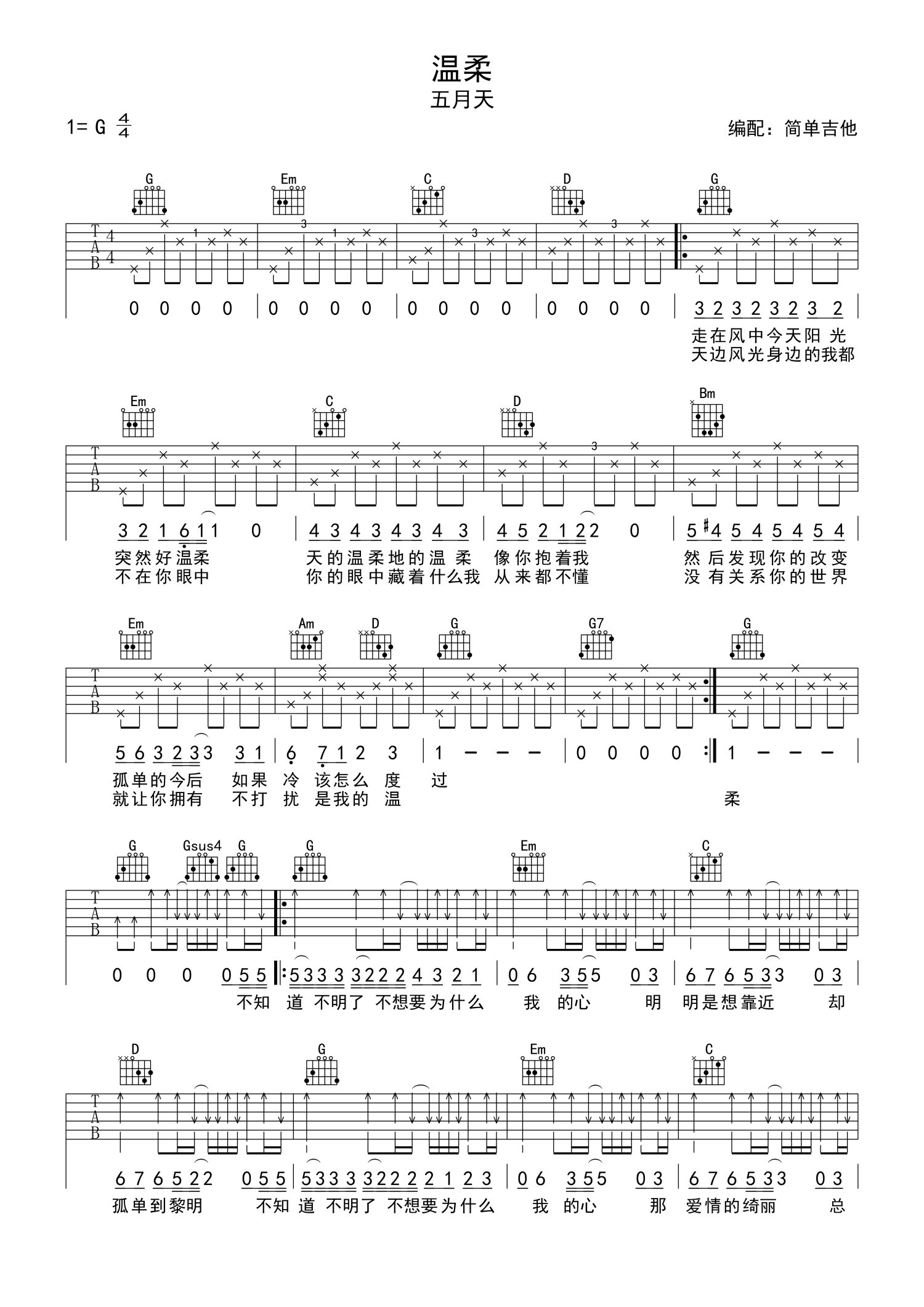 • 温柔吉他谱 - 五月天 - G调吉他弹唱谱第1张