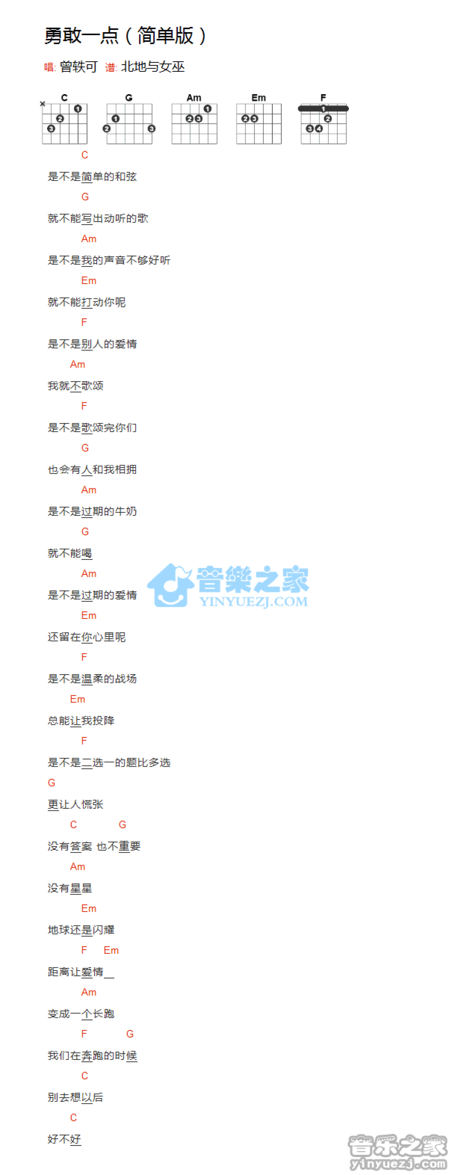 曲谱介绍: 简单版《勇敢一点》吉他和弦弹唱谱