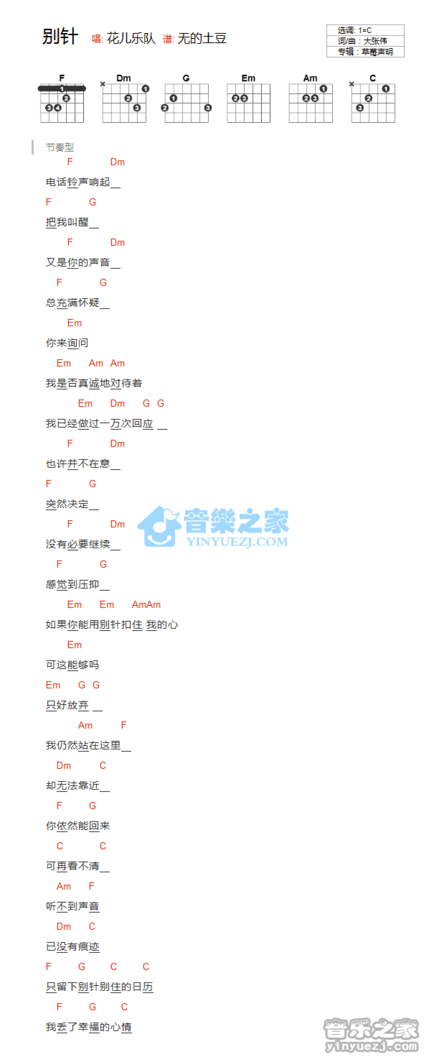 别针吉他谱 - 花儿乐队 - C调吉他弹唱谱 - 和弦谱