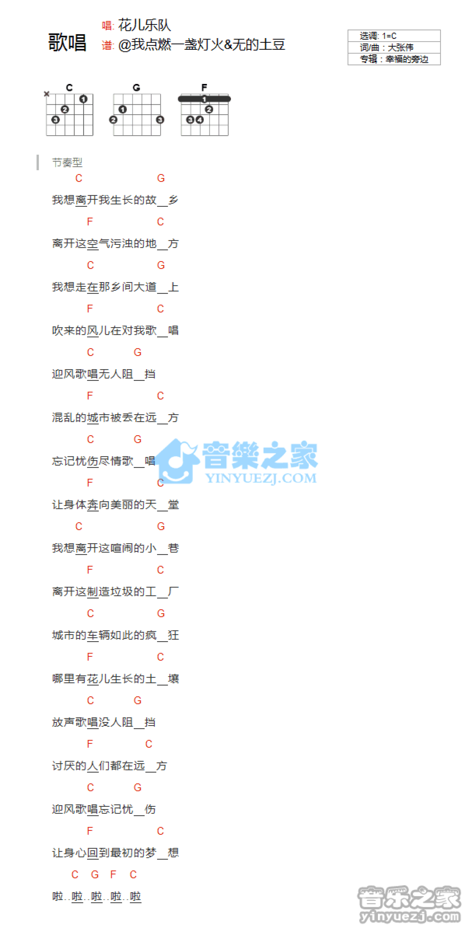 曲谱介绍: C调版花儿乐队《歌唱》吉他和弦弹唱谱