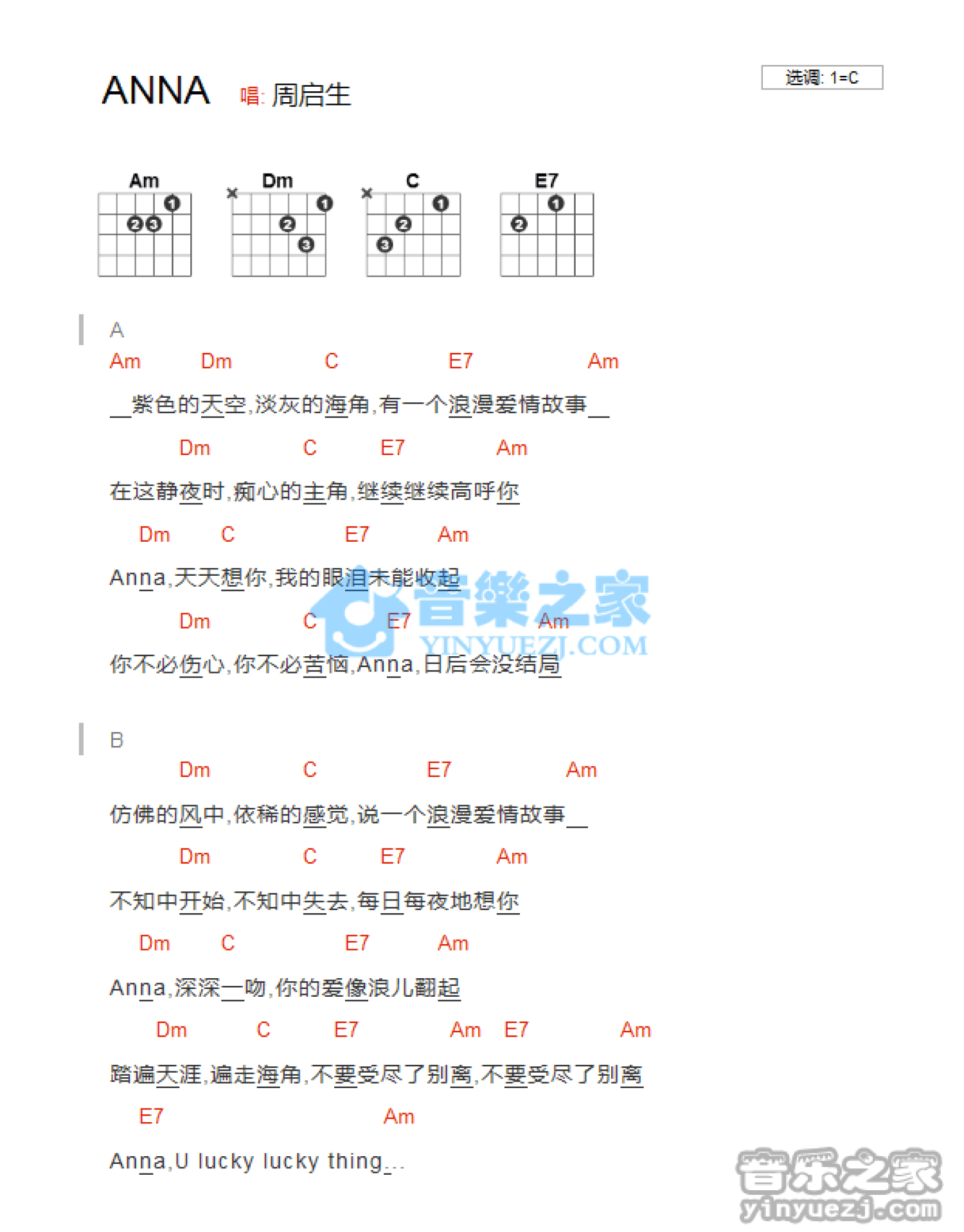曲谱介绍: C调版周启生《ANNA》吉他和弦弹唱谱
