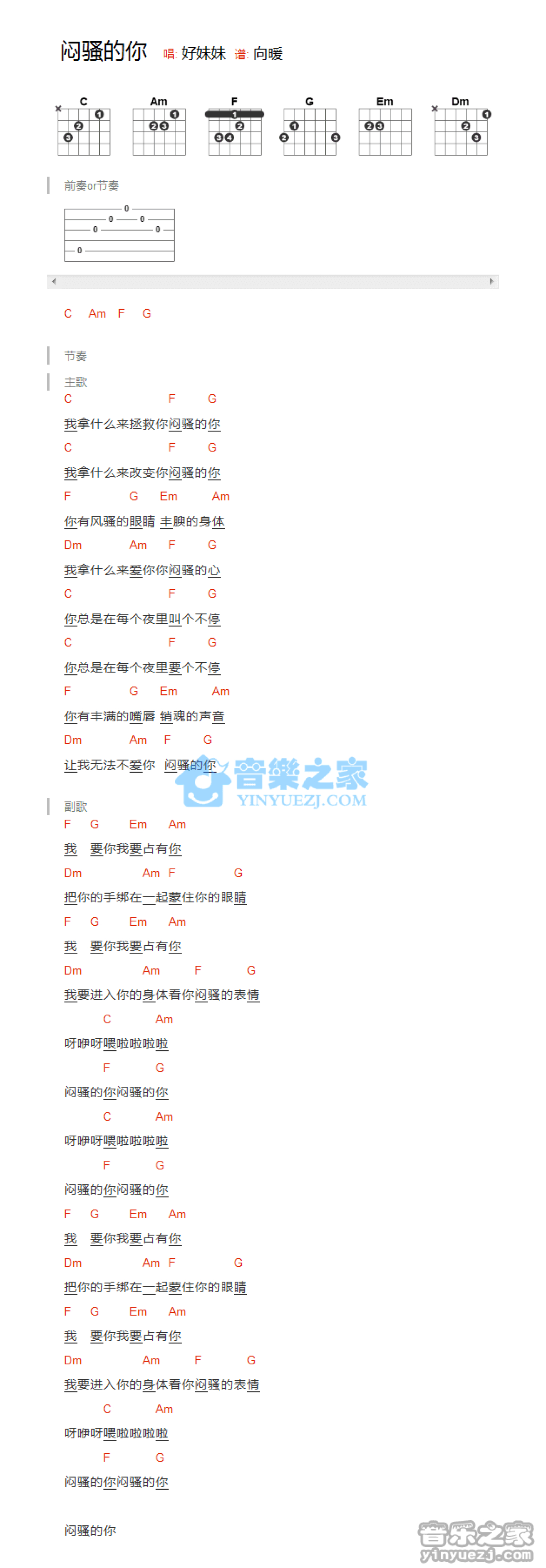 曲谱介绍: 好妹妹《闷骚的你》吉他和弦弹唱谱