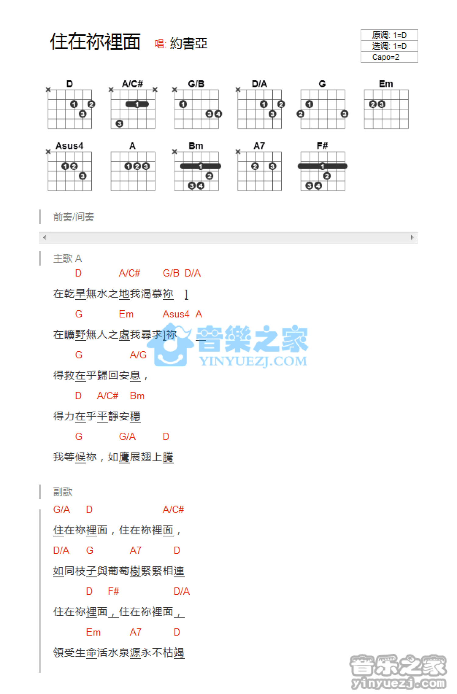 曲谱介绍: D调版约书亚《住在你里面》吉他和弦弹唱谱