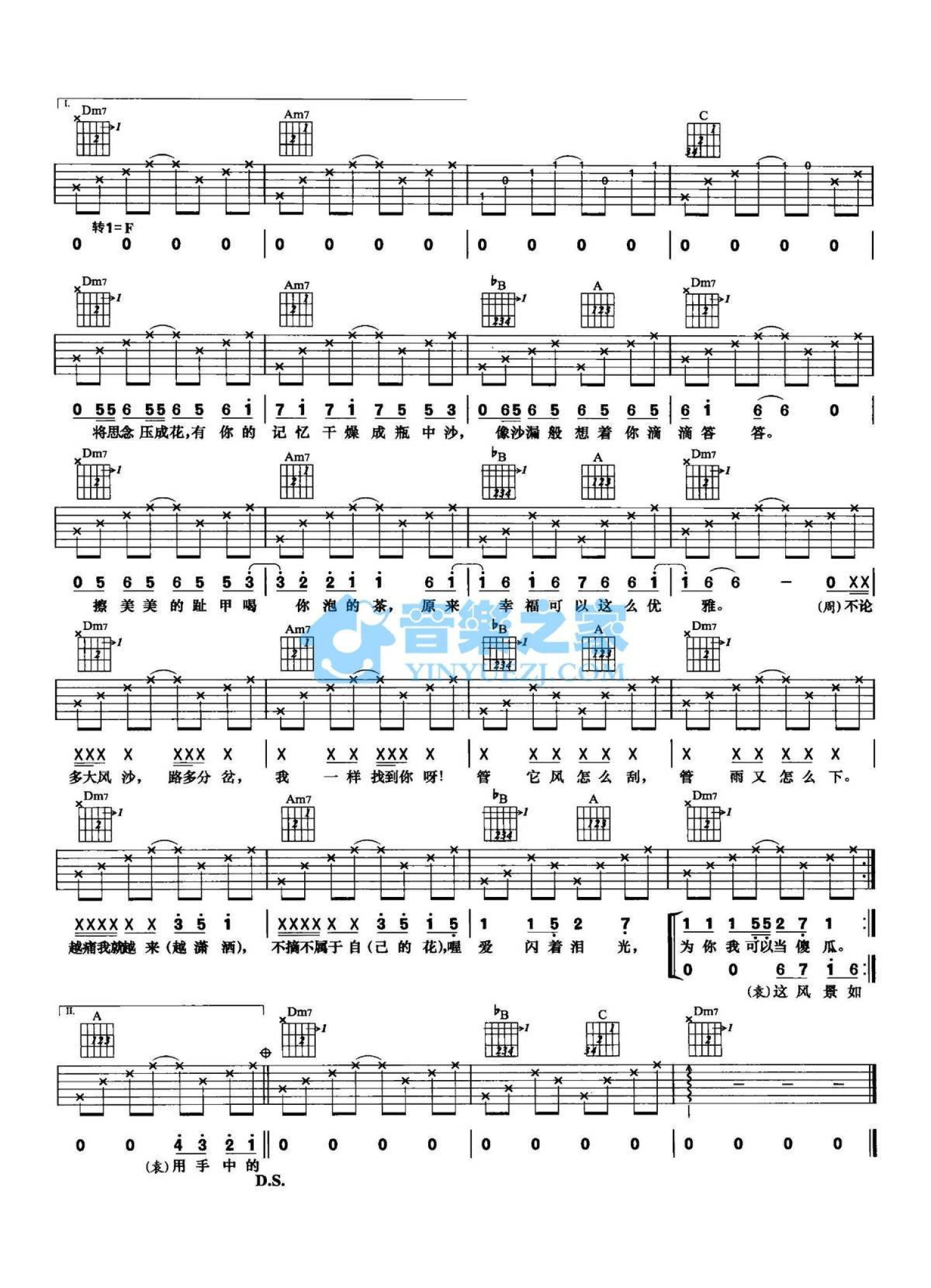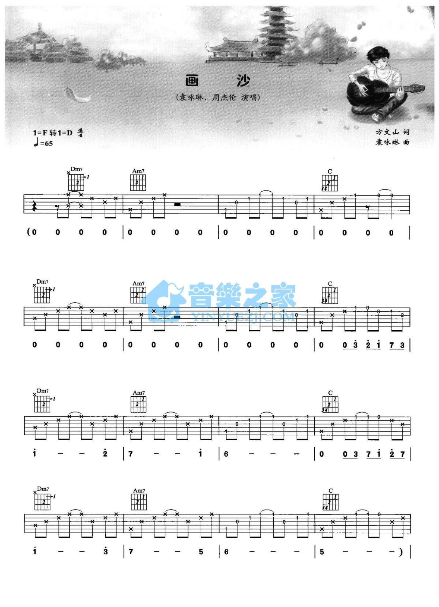 曲谱介绍: F转D调版袁咏琳/周杰伦《画沙》吉他弹唱六线谱
