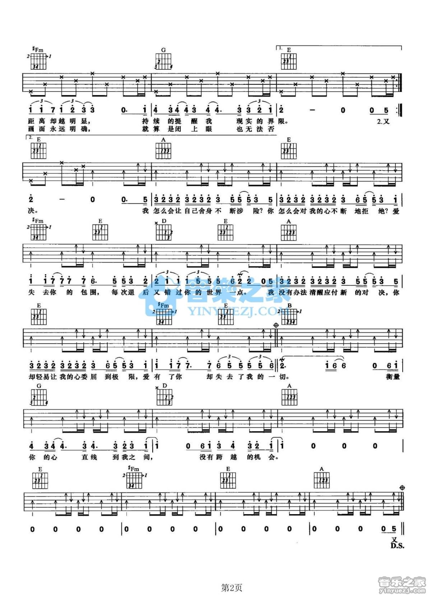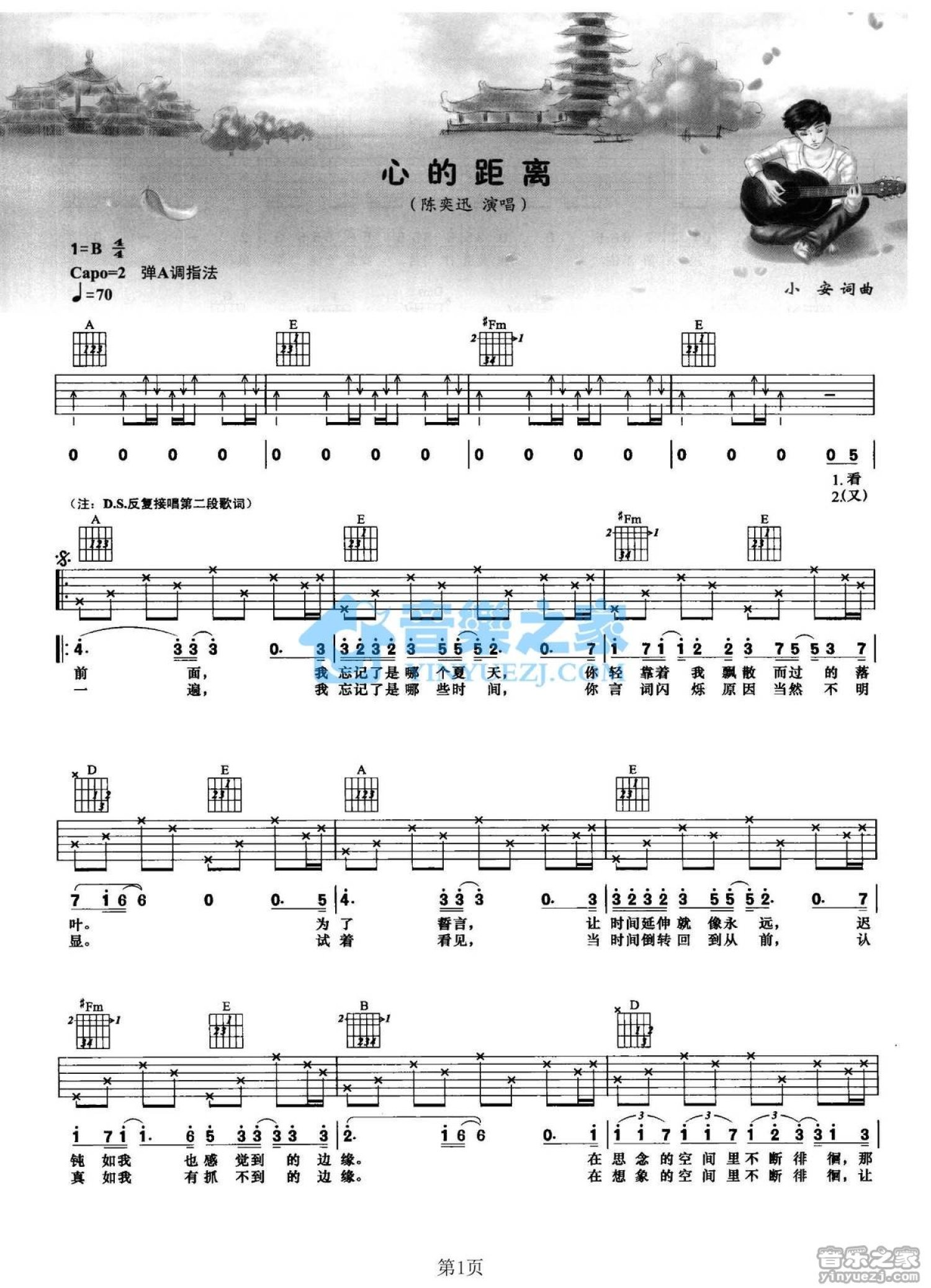 曲谱介绍: A调版《心的距离》吉他弹唱六线谱