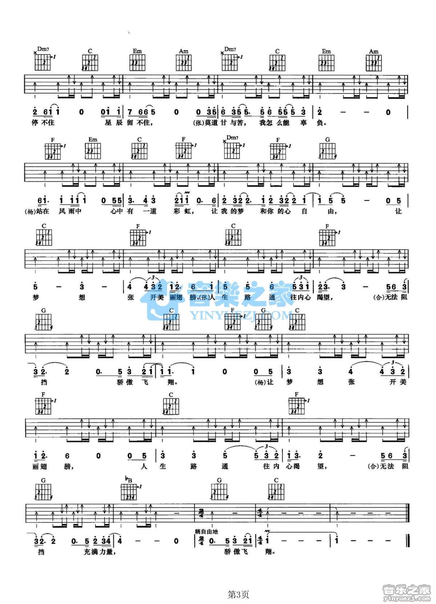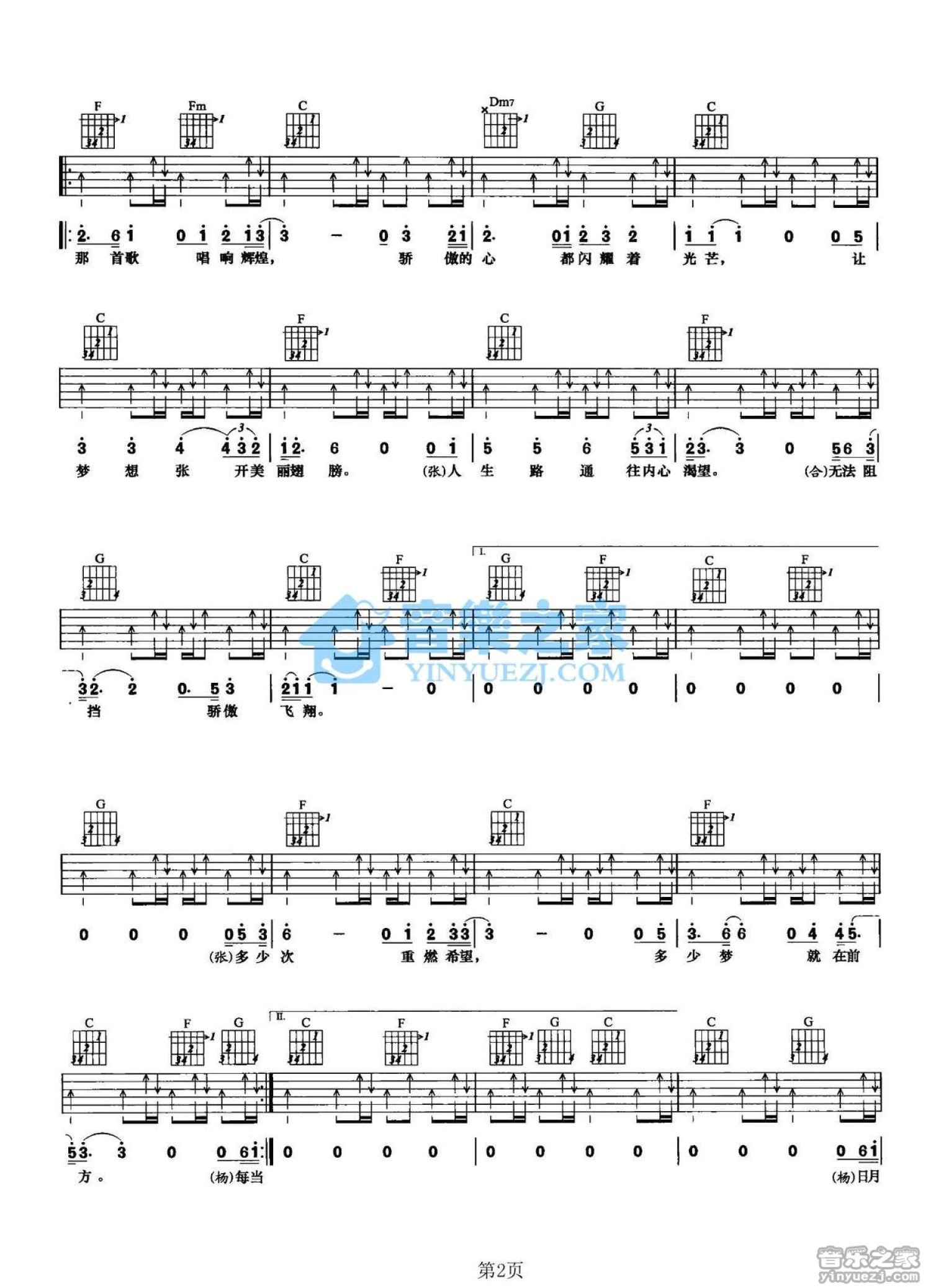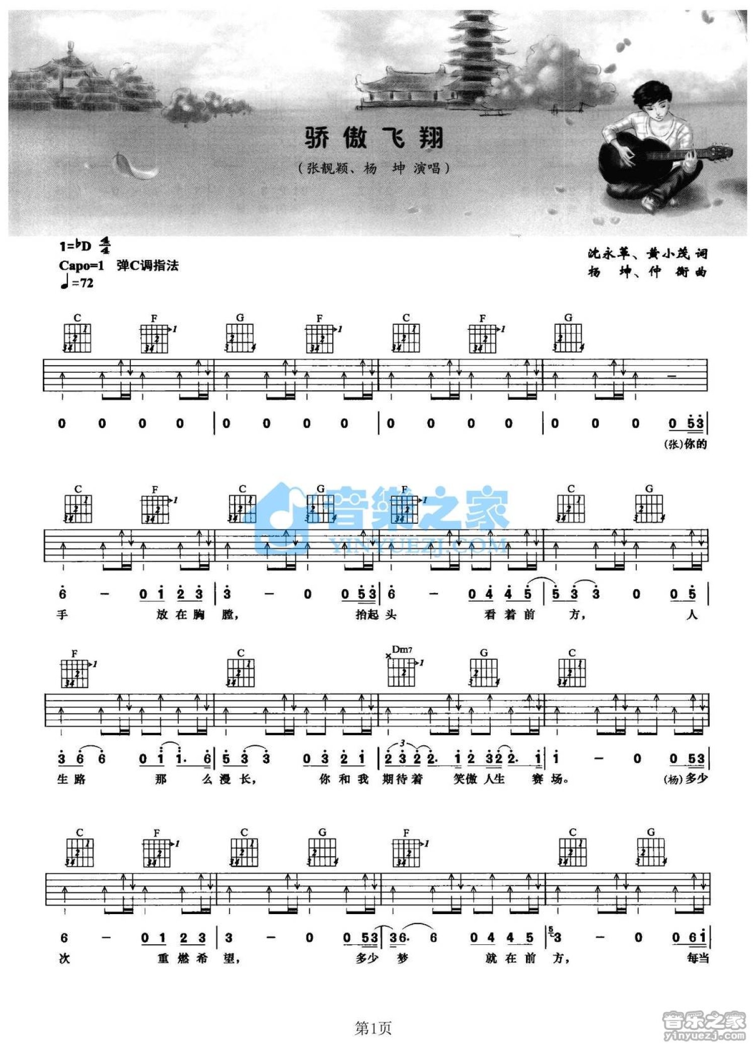 曲谱介绍: C调版《骄傲飞翔》吉他弹唱六线谱