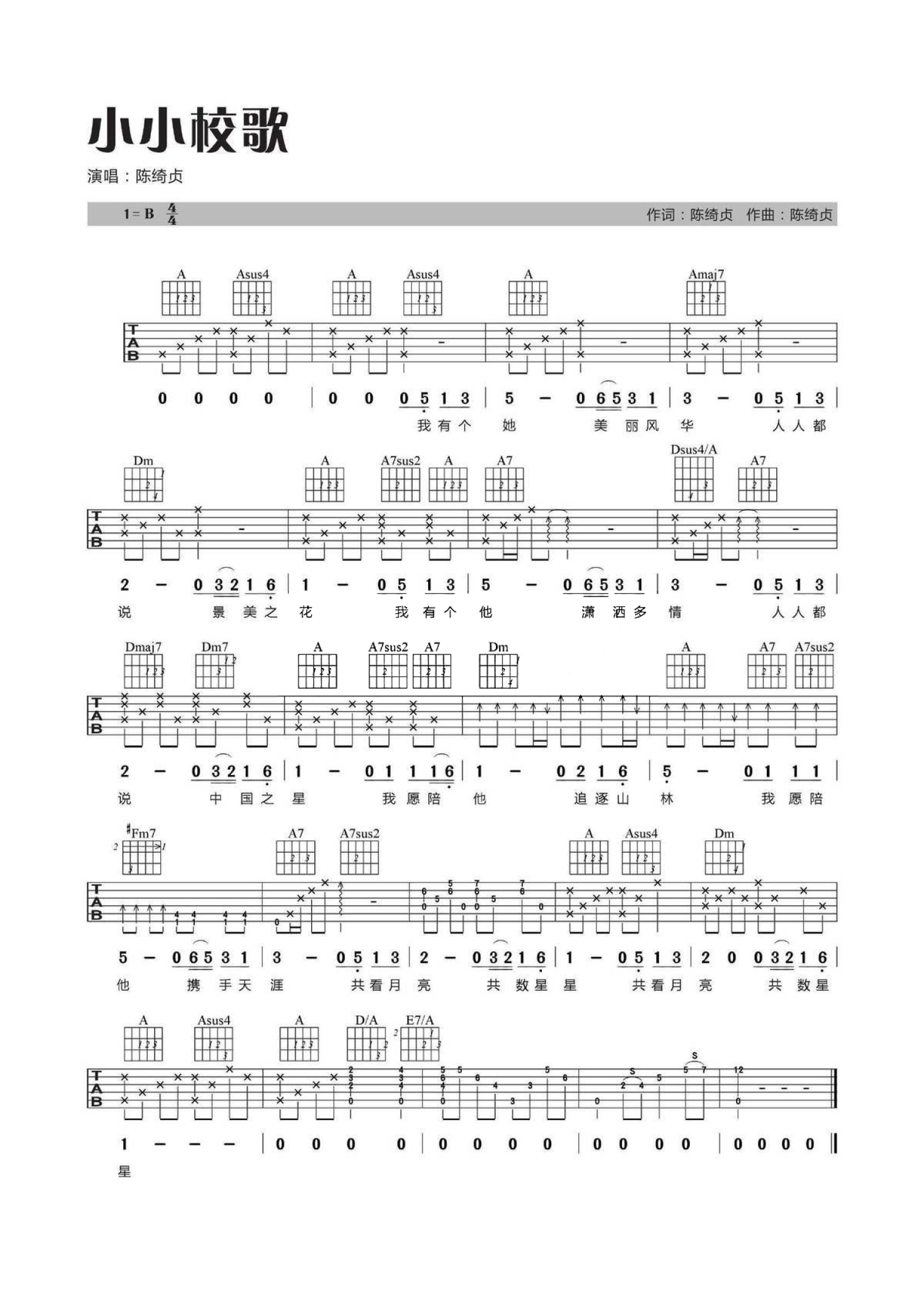 曲谱介绍: B调版《小小校歌》吉他弹唱六线谱