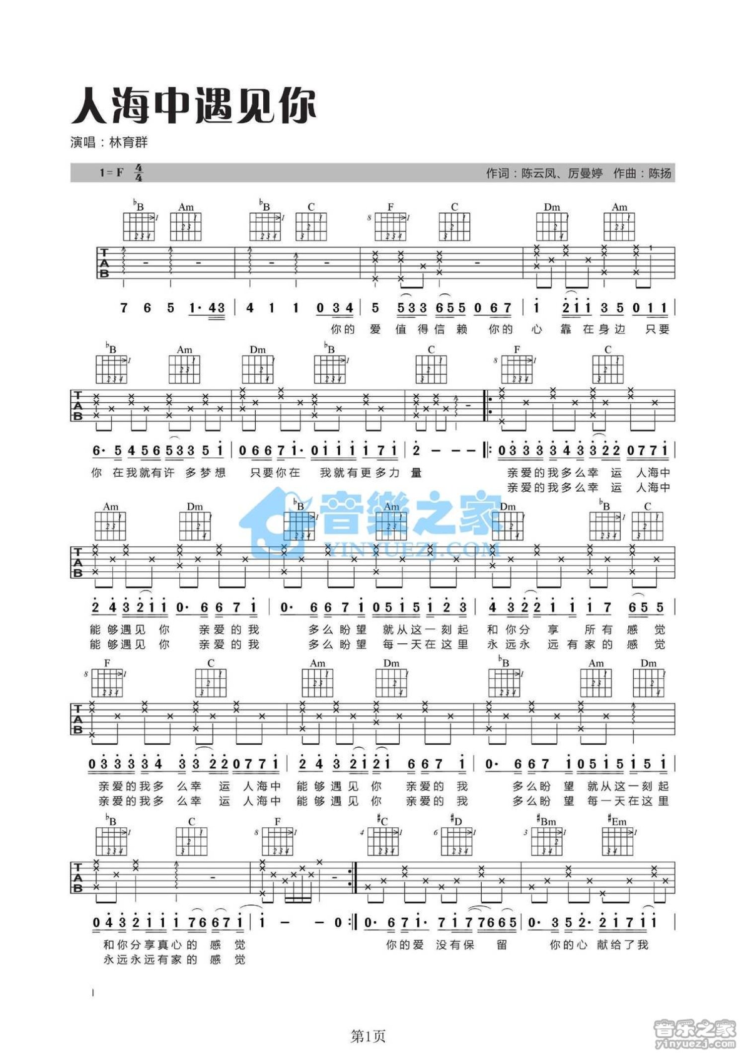人海中遇见你吉他谱 - 林育群 - F调吉他弹唱谱