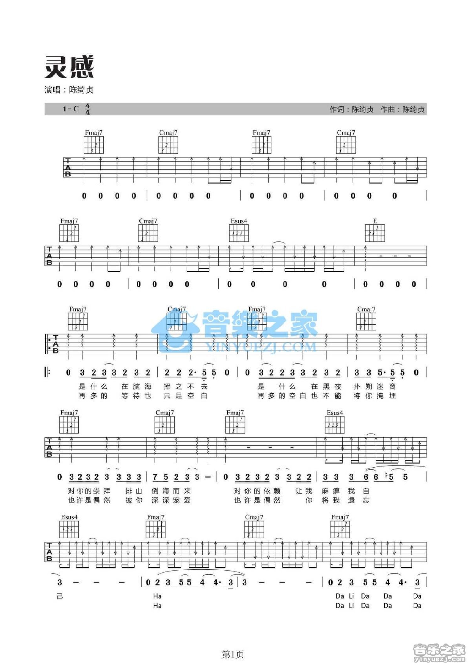 曲谱介绍: C调版陈绮贞《灵感》吉他弹唱六线谱
