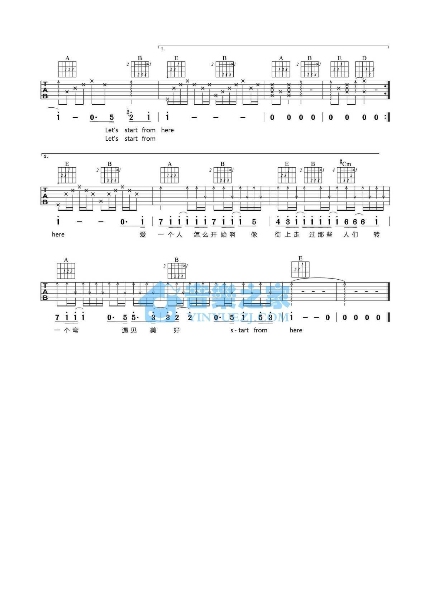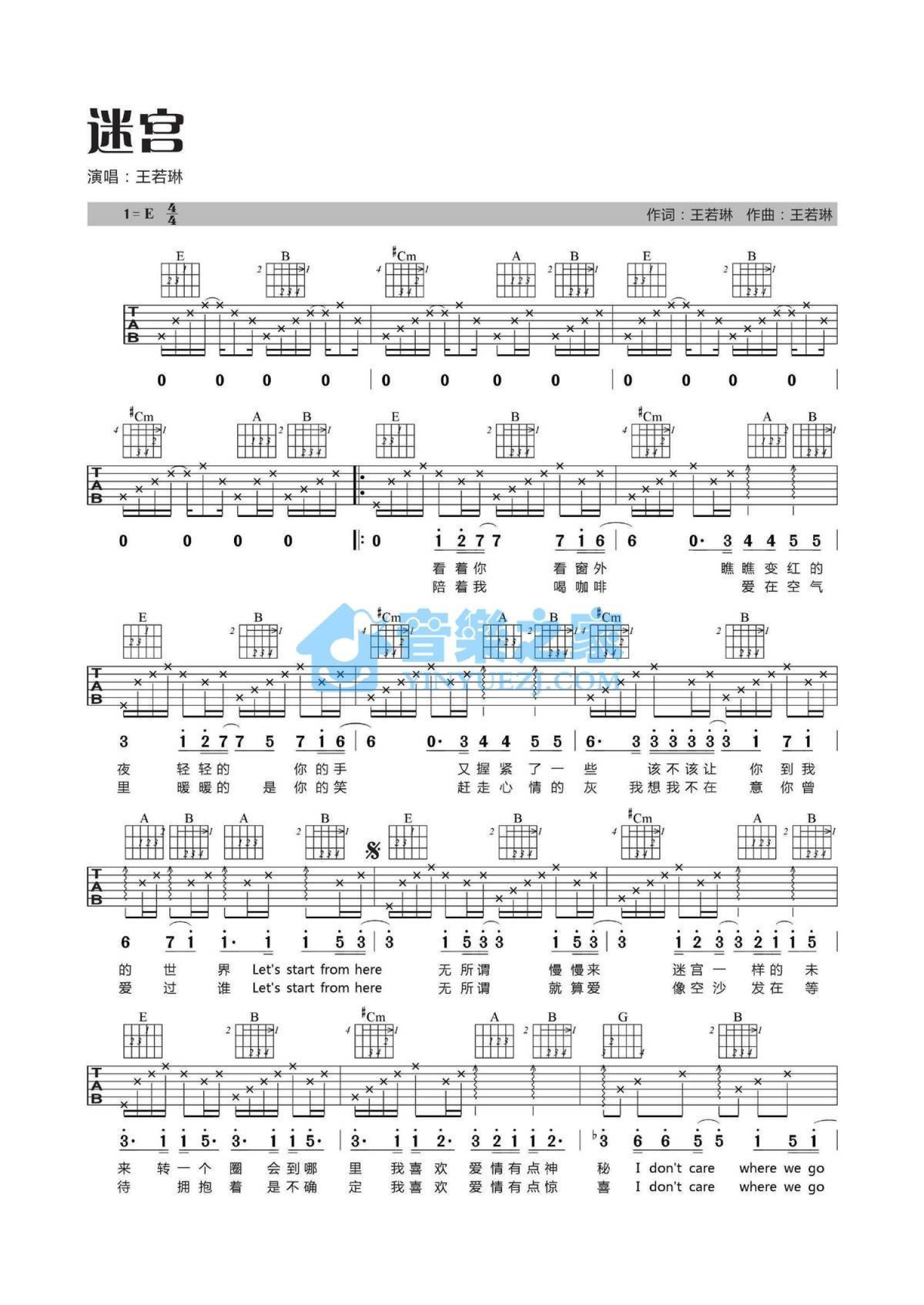 曲谱介绍: E调版王若琳《迷宫》吉他弹唱六线谱