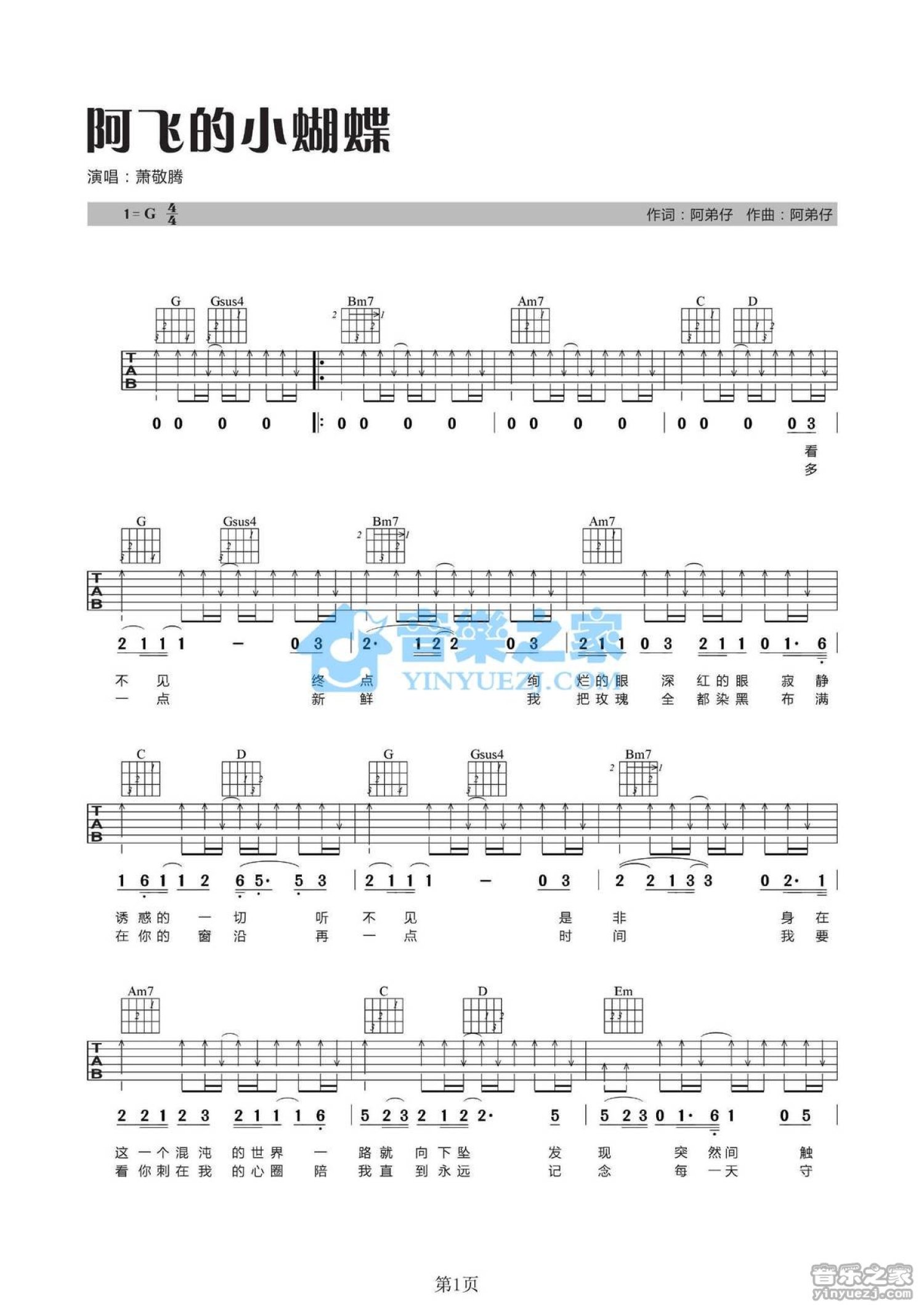 曲谱介绍: G调版萧敬腾《阿飞的小蝴蝶》吉他弹唱六线谱