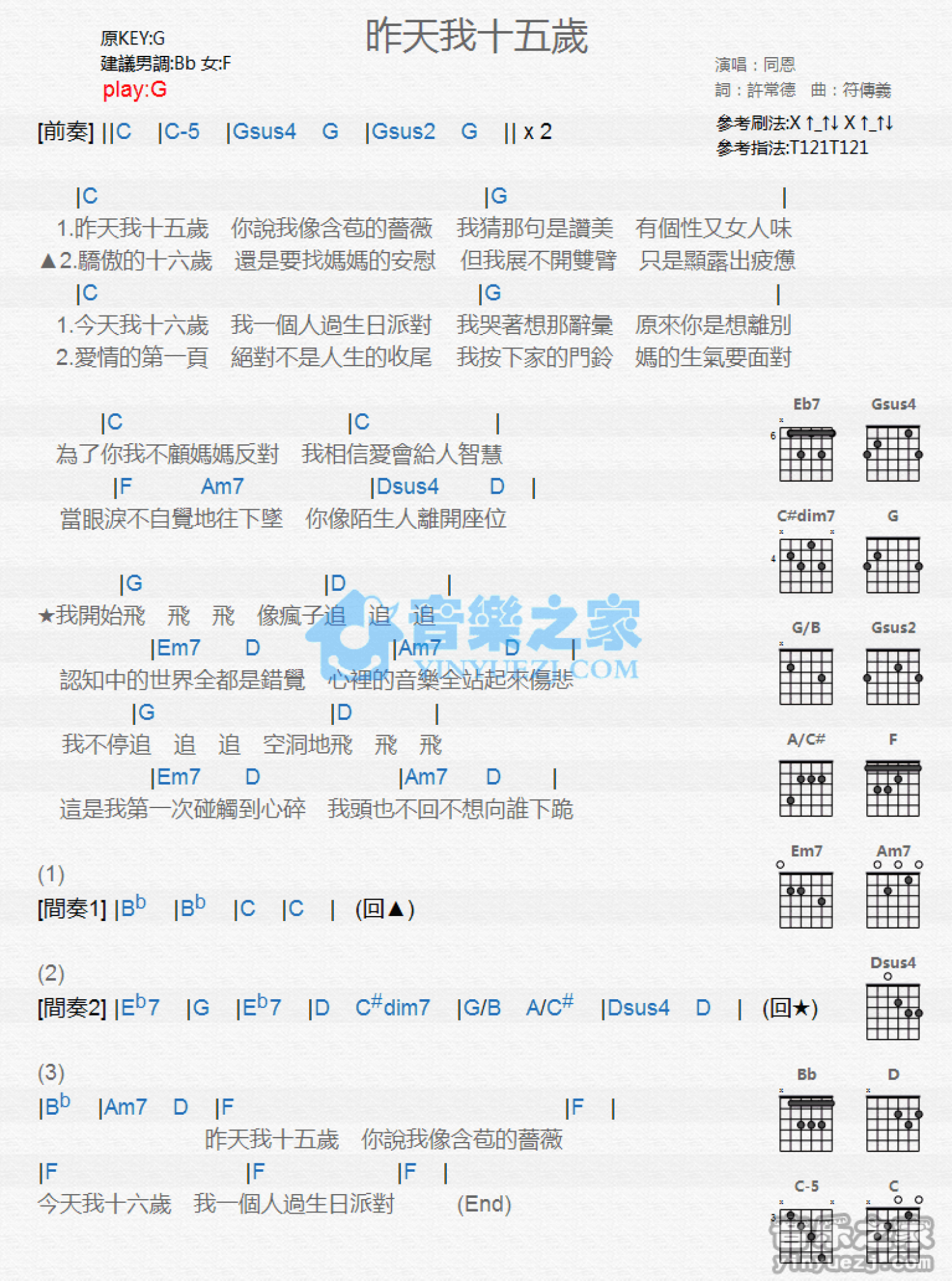曲谱介绍: G调版《昨天我十五岁》吉他和弦弹唱谱