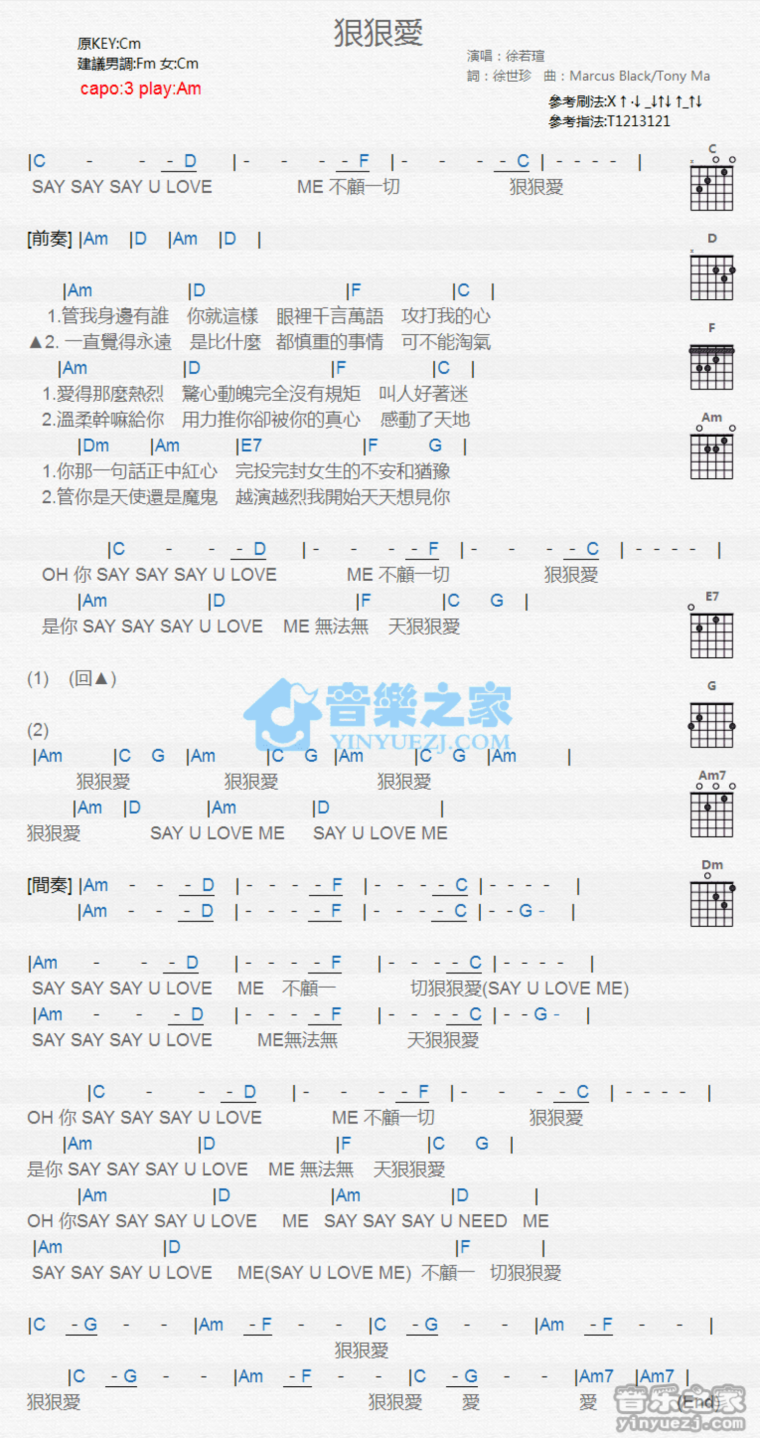 曲谱介绍: Am调版徐若u《狠狠爱》吉他和弦弹唱谱
