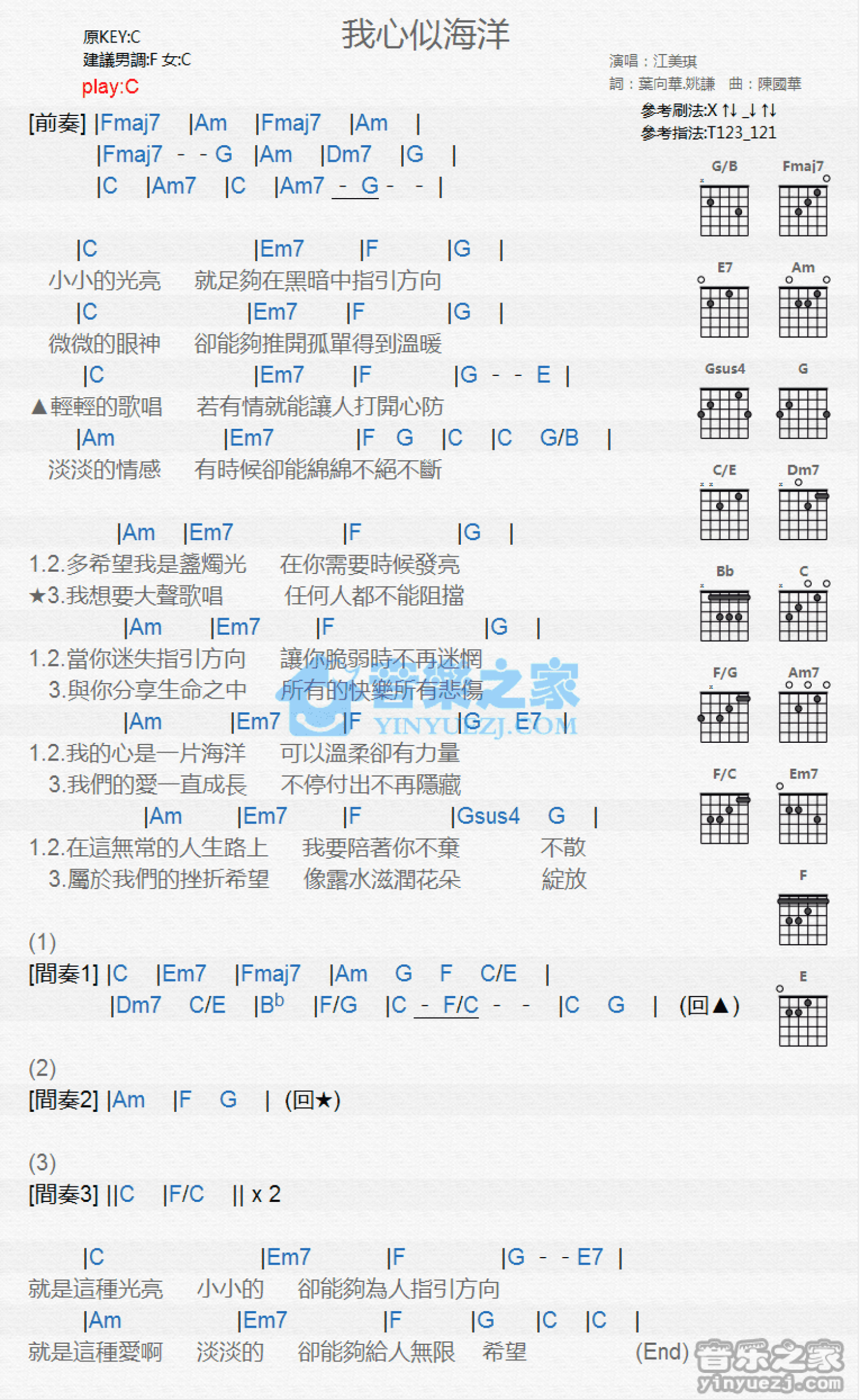 曲谱介绍: C调版《我心似海洋》吉他和弦弹唱谱