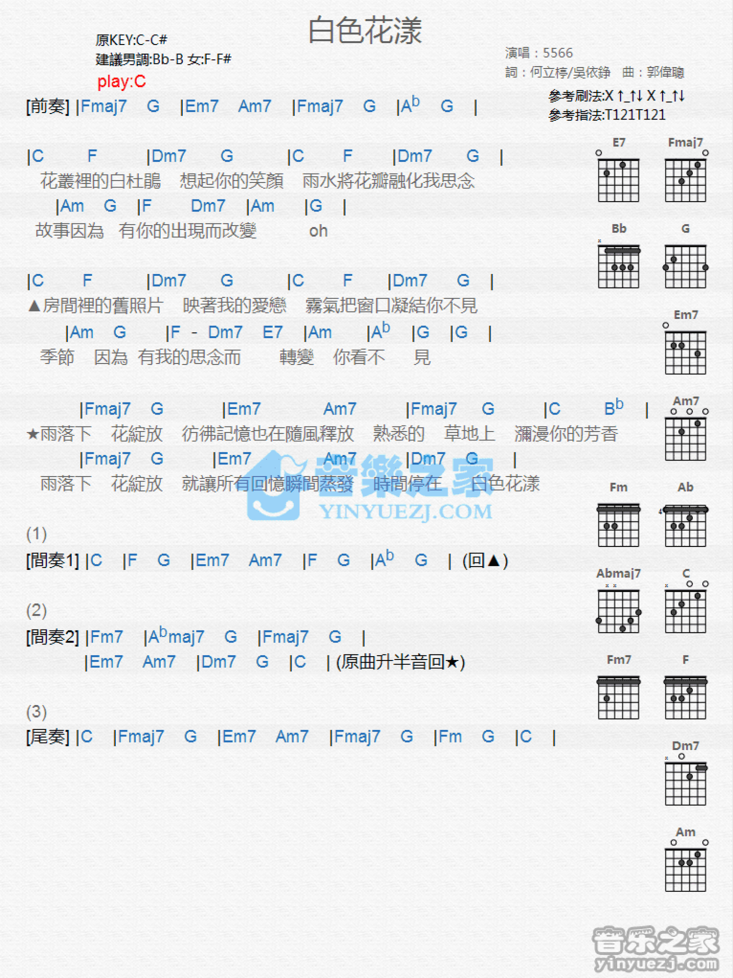 曲谱介绍: C调版5566《-白色花漾》吉他和弦弹唱谱