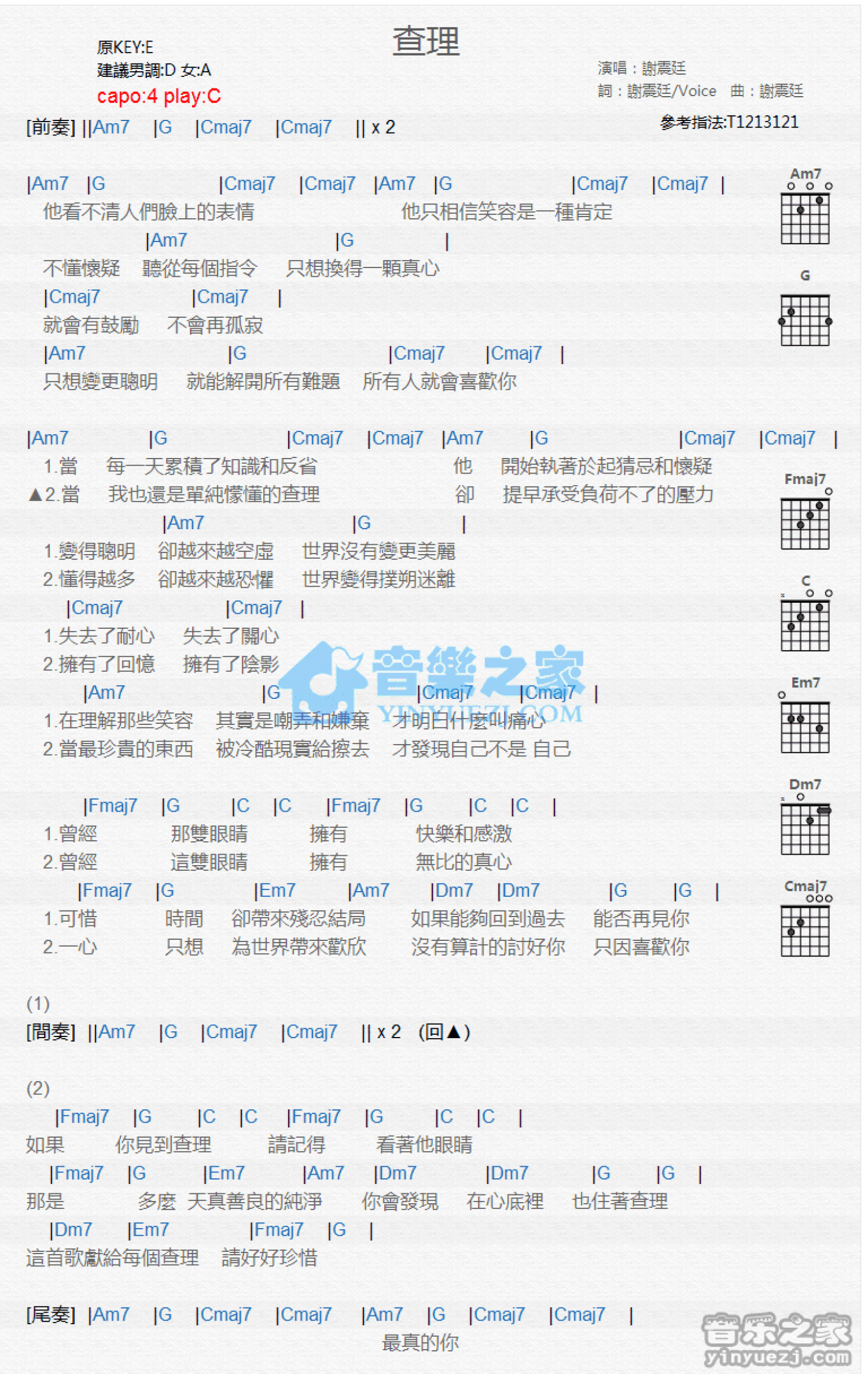 曲谱介绍: C调版谢震廷《查理》吉他和弦弹唱谱