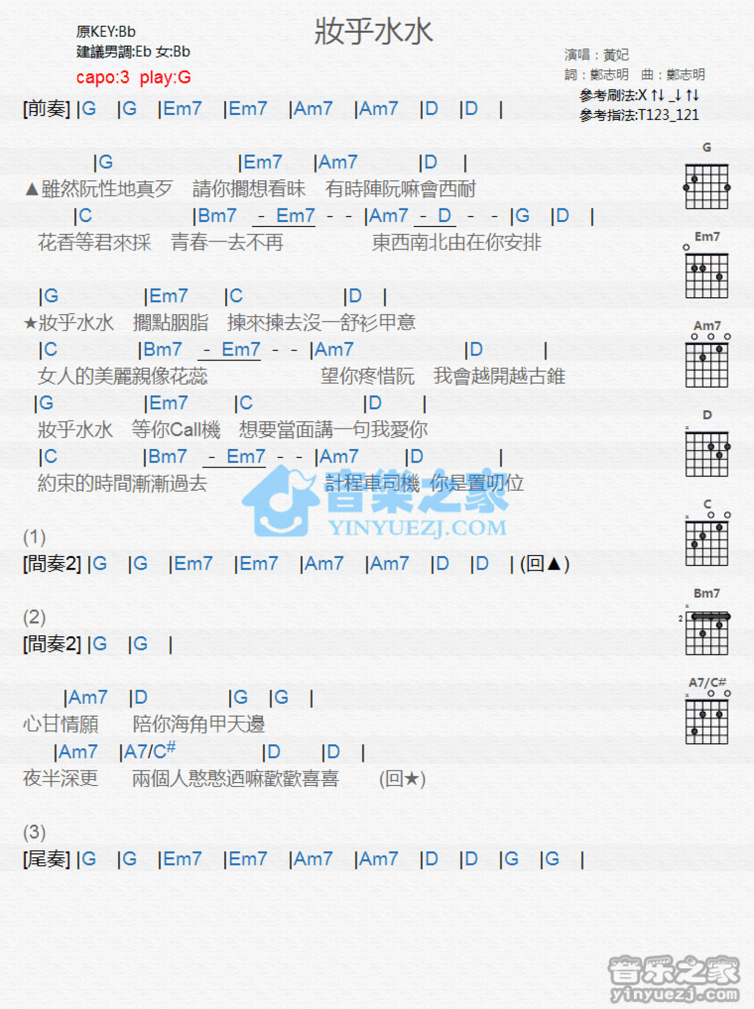 曲谱介绍: G调版黄妃《妆乎水水》吉他和弦弹唱谱