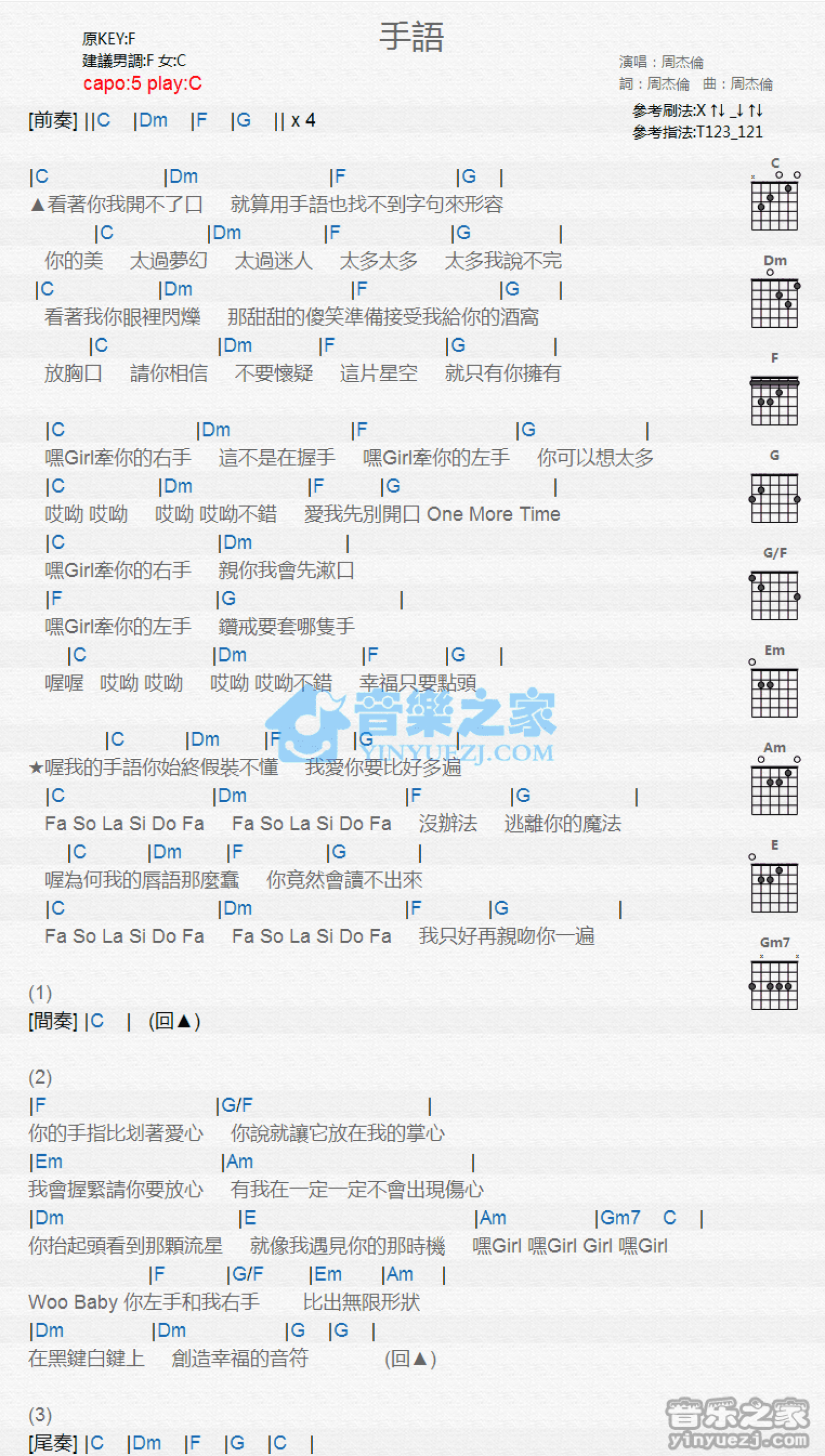 曲谱介绍: C调版周杰伦《手语》吉他和弦弹唱谱