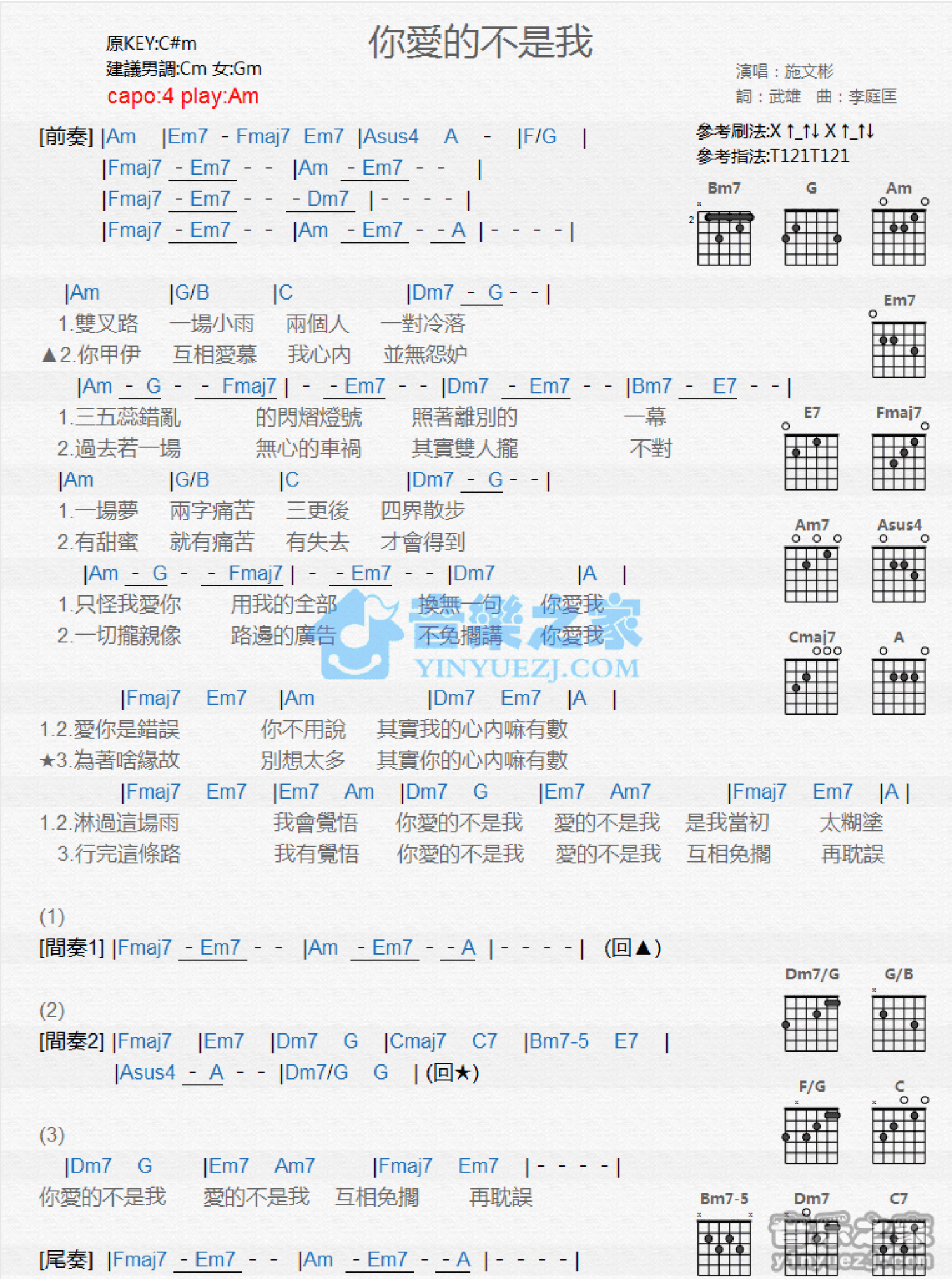曲谱介绍: Am调版施文斌《你爱的不是我》吉他和弦弹唱谱