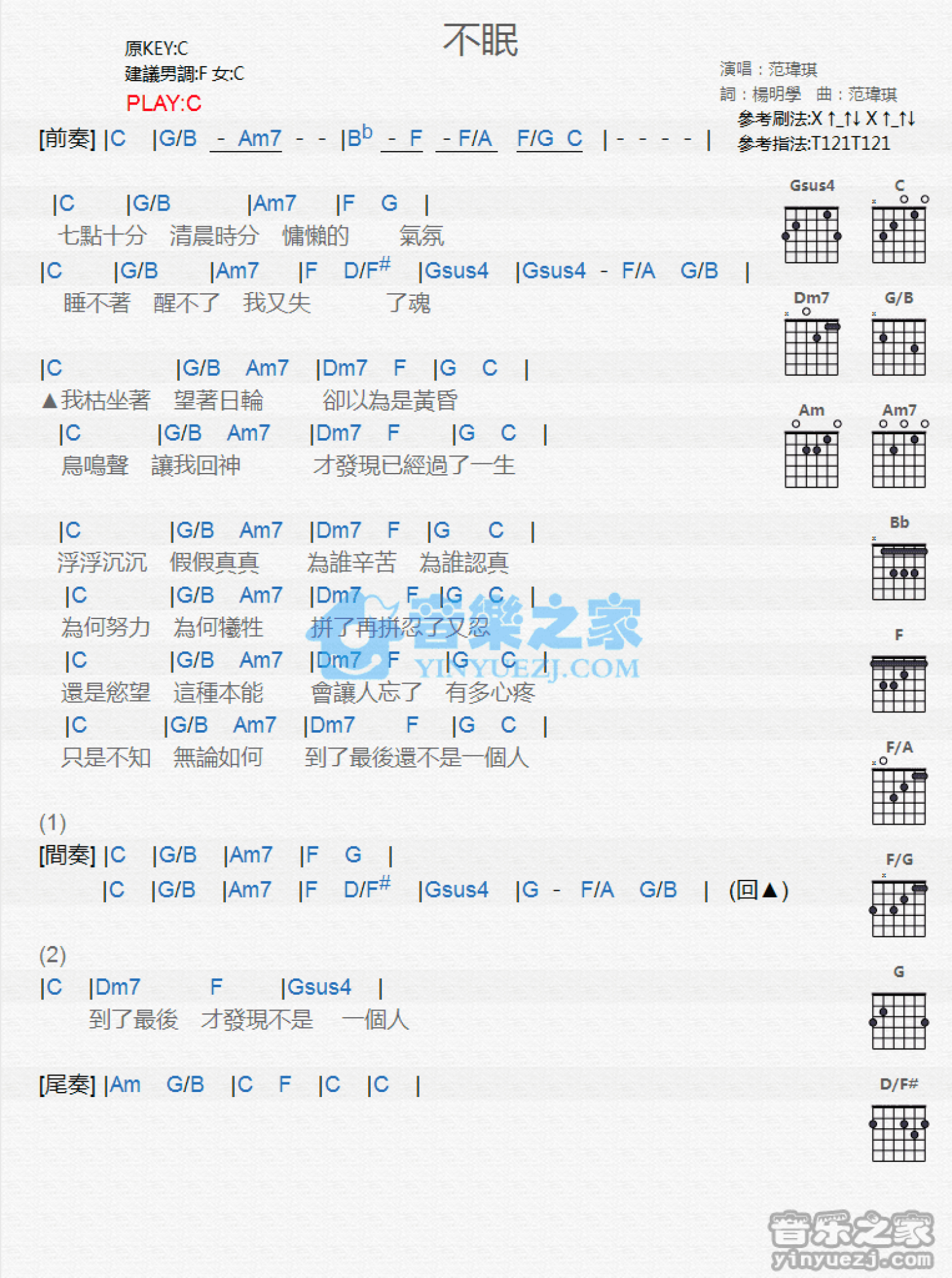 曲谱介绍: C调版范玮琪《不眠》吉他和弦弹唱谱