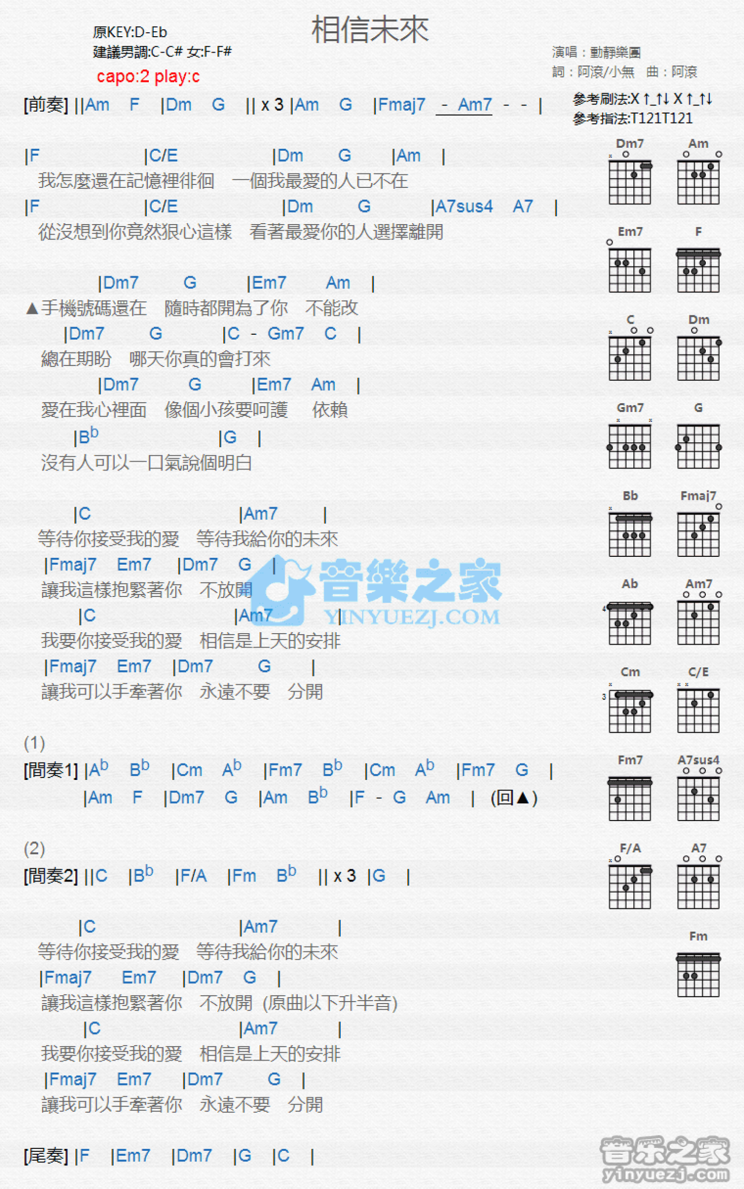 曲谱介绍: C调版《相信未来》吉他和弦弹唱谱