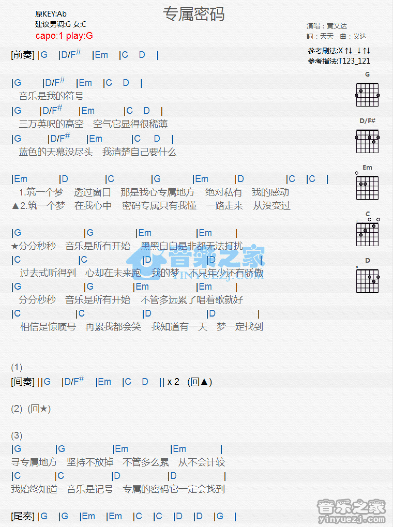 曲谱介绍: G调版黄义达《专属密码》吉他和弦弹唱谱