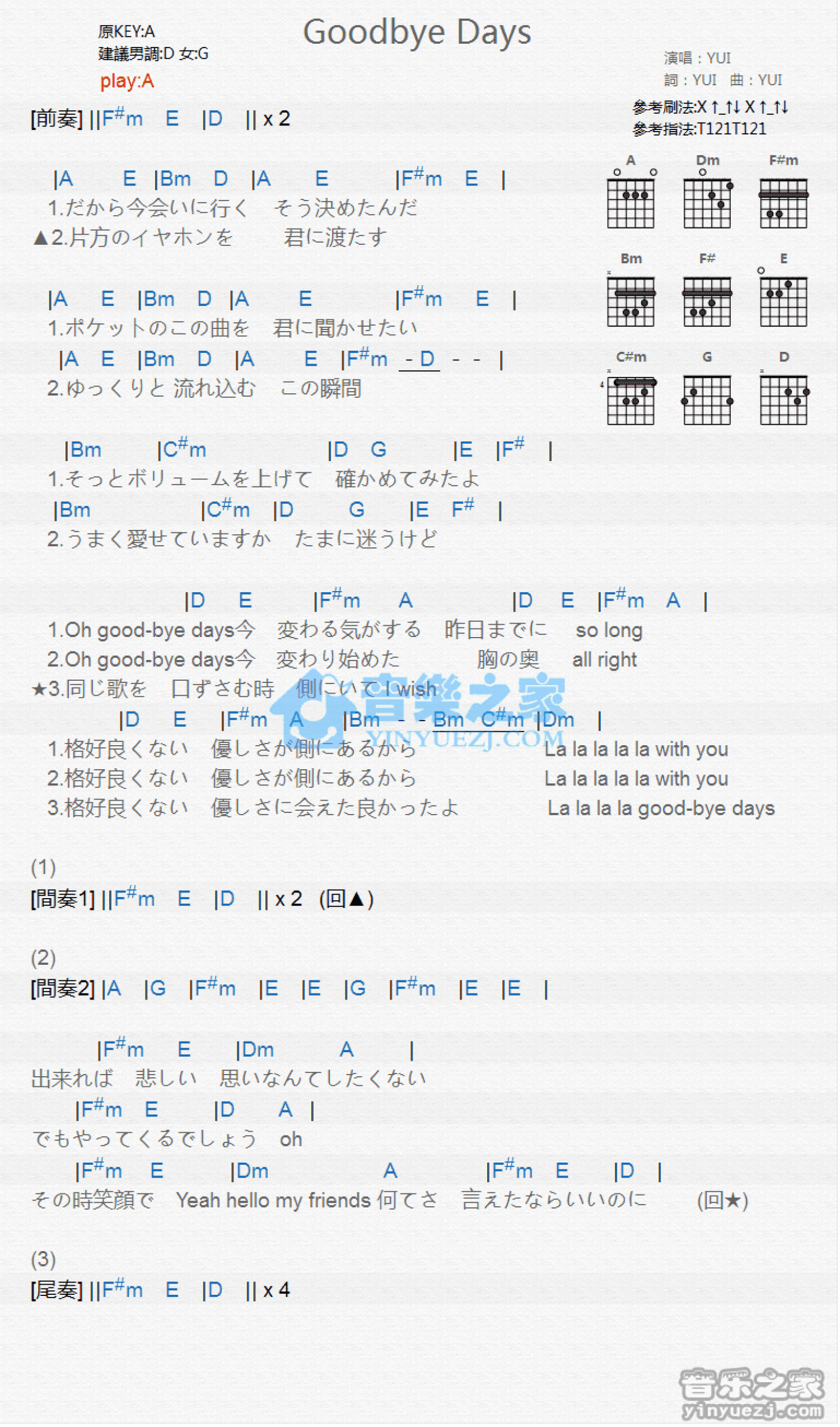 曲谱介绍: A调版YUI《GoodbyeDays》吉他和弦弹唱谱
