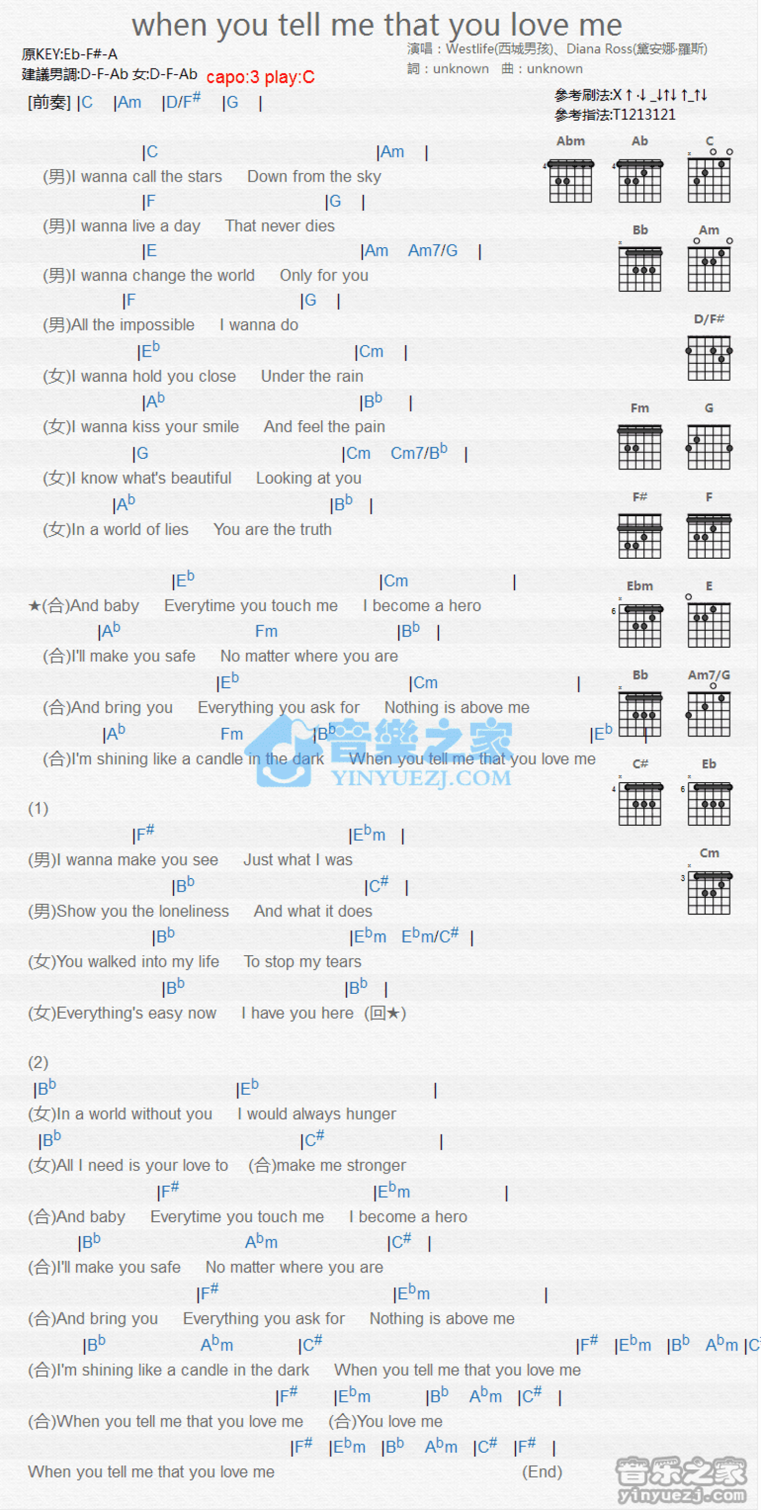 曲谱介绍: C调版《WhenYouTellMeThatYouLoveMe》吉他和弦弹唱谱