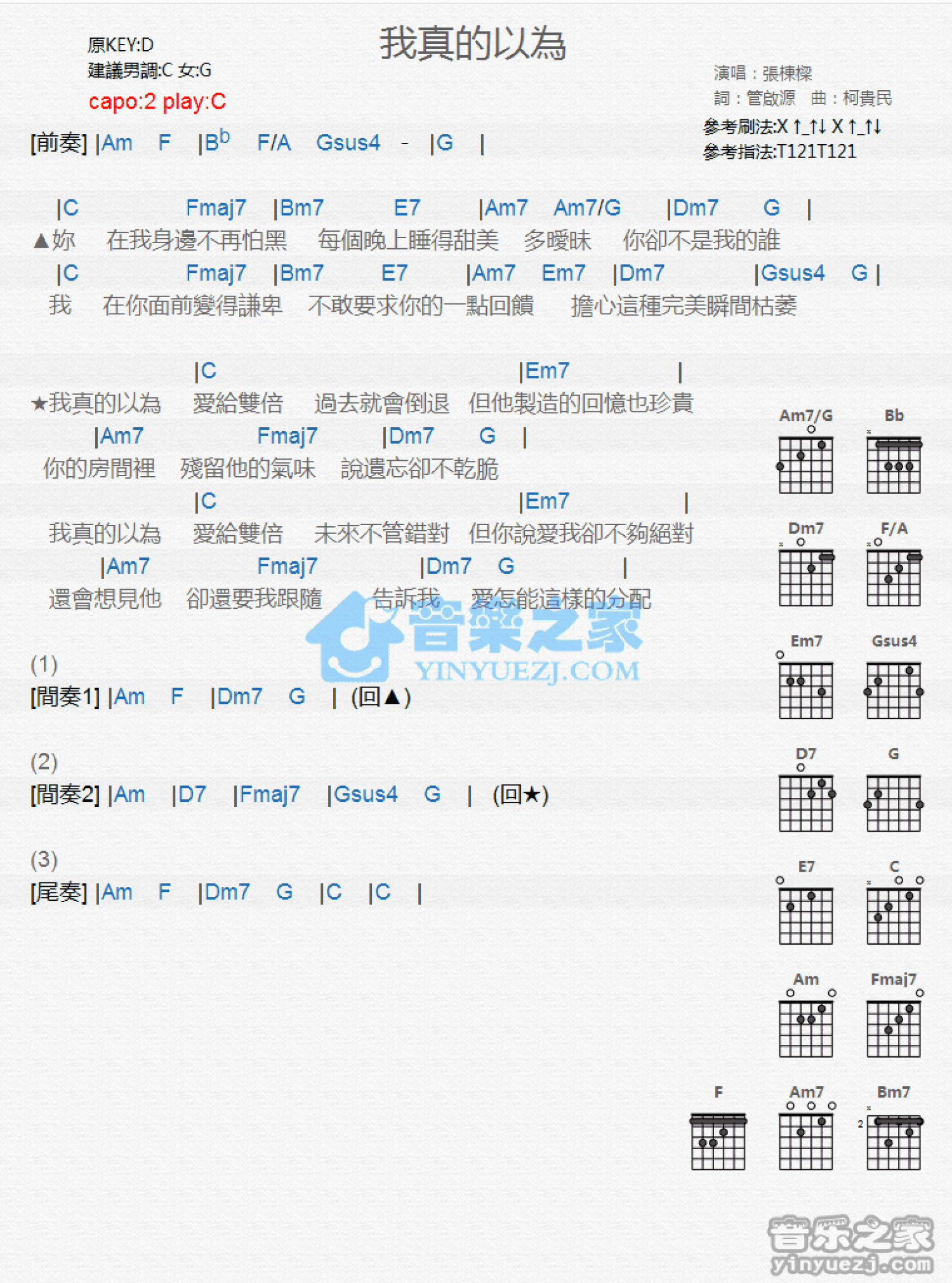 曲谱介绍: C调版张栋梁《我真的以为》吉他和弦弹唱谱
