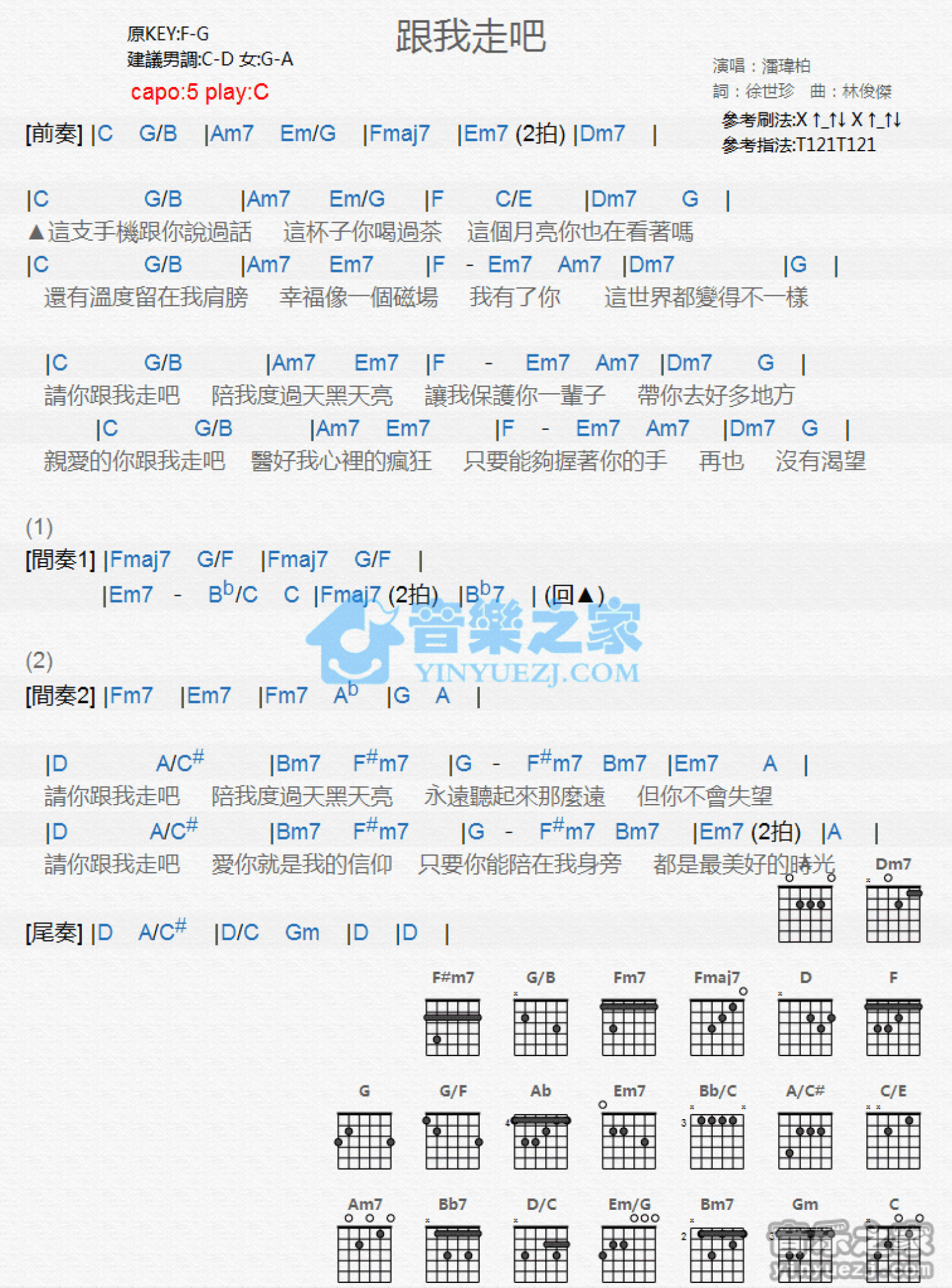 曲谱介绍: C调版潘玮柏《跟我走吧》吉他和弦弹唱谱