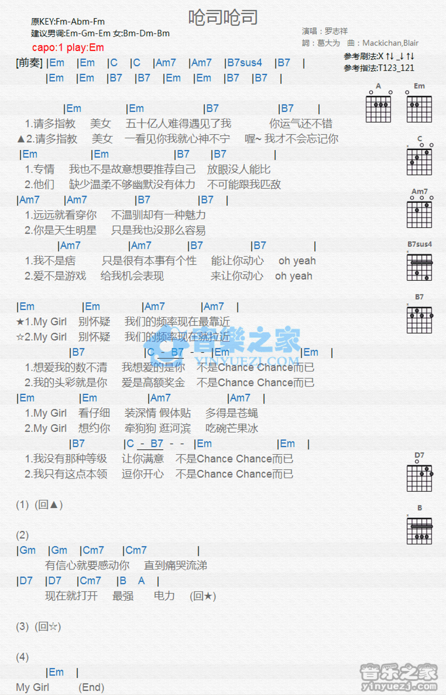 曲谱介绍: Em调版罗志祥《呛司呛司》吉他和弦弹唱谱