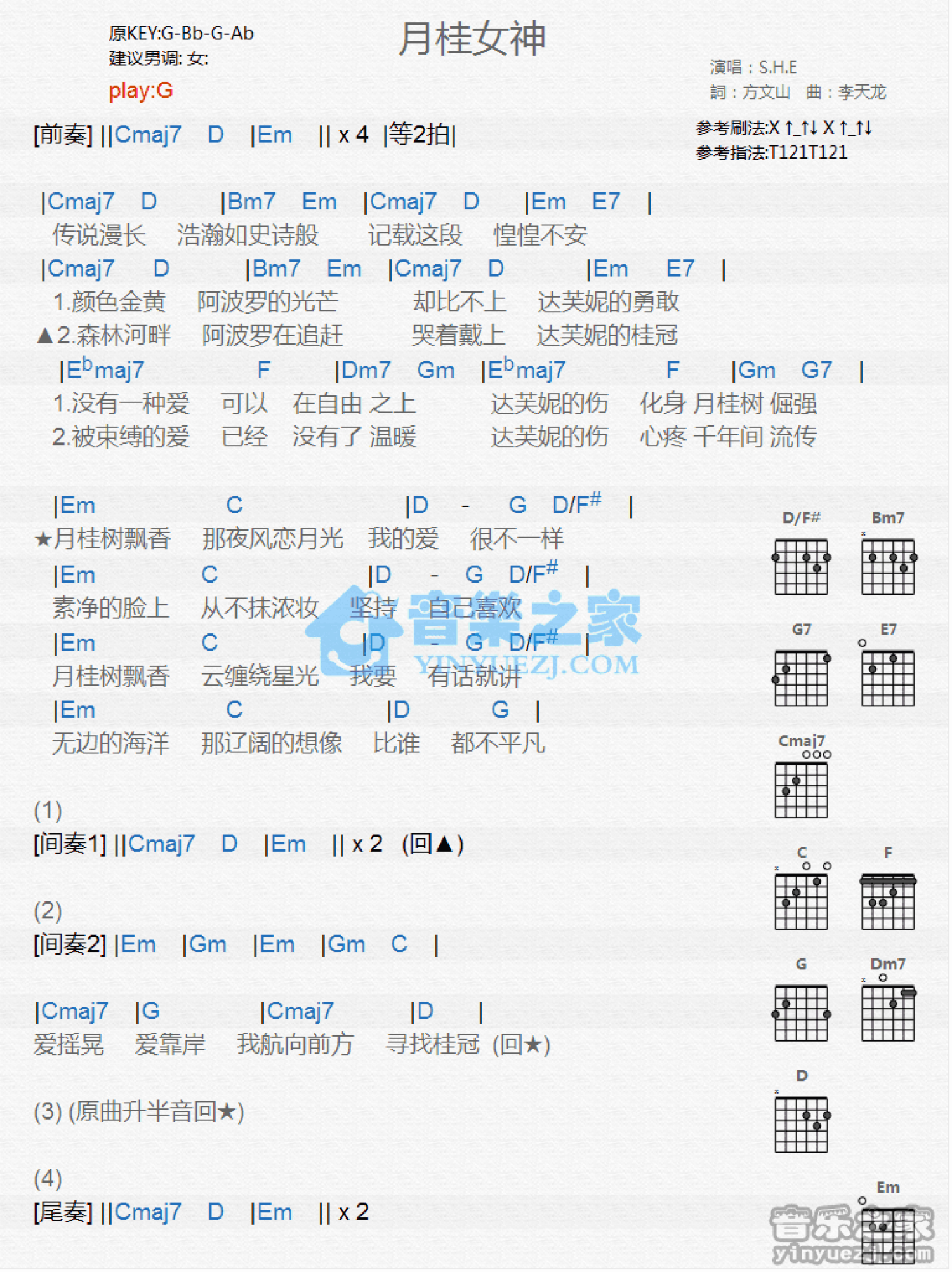 曲谱介绍: G调版S.H.E《月桂女神》吉他和弦弹唱谱