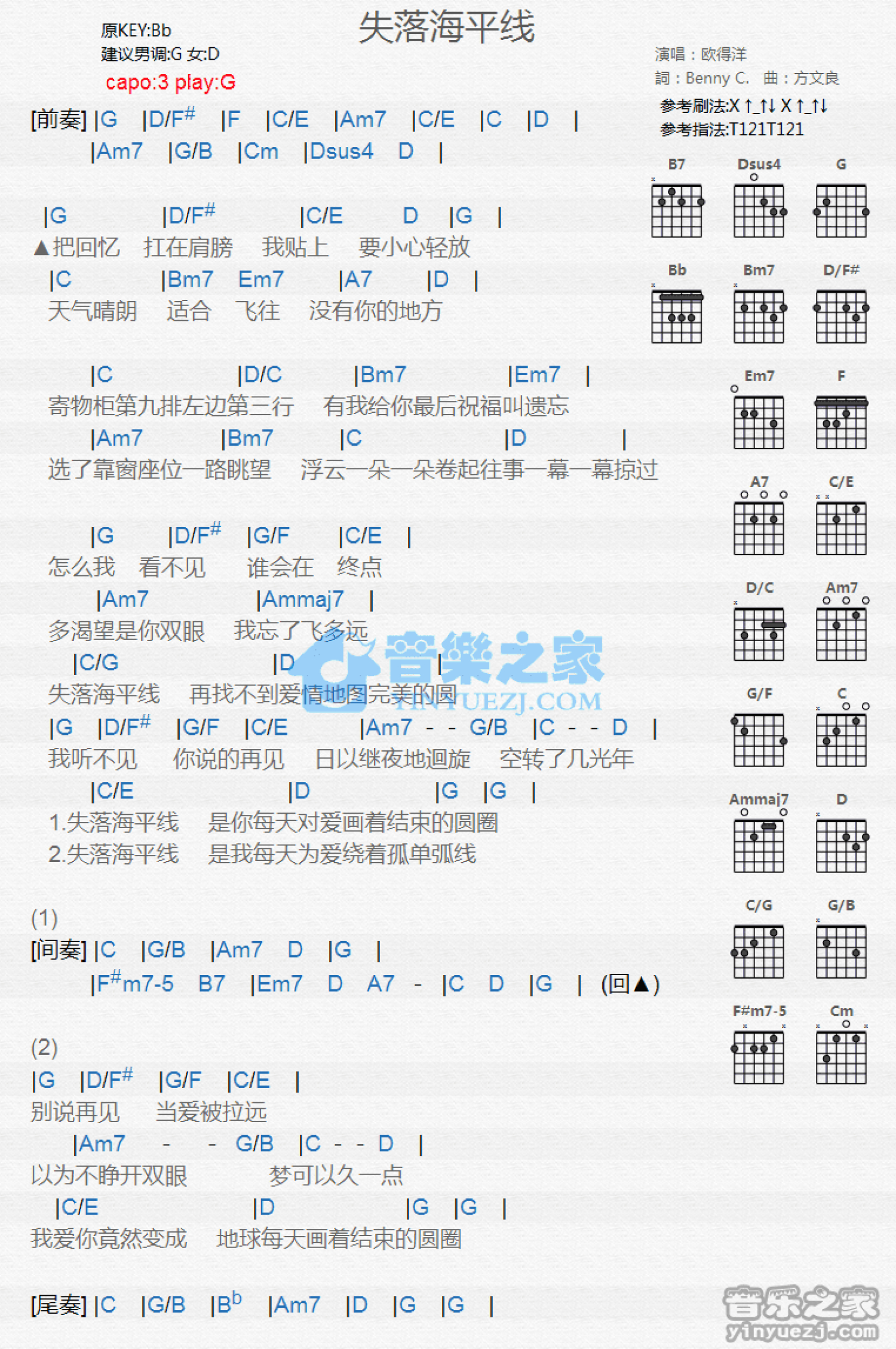 曲谱介绍: G调版欧得洋《失落海平线》吉他和弦弹唱谱